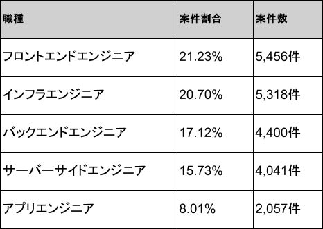 React案件の職種ではフロントエンドエンジニアが21.23%(5,456件)で最多となり、インフラエンジニアが20.70%(5,318件)、バックエンドエンジニアが17.12%(4,400件)、サーバーサイドエンジニアが15.73%(4,041件)、アプリエンジニアが8.01%(2,057件)と続きます。