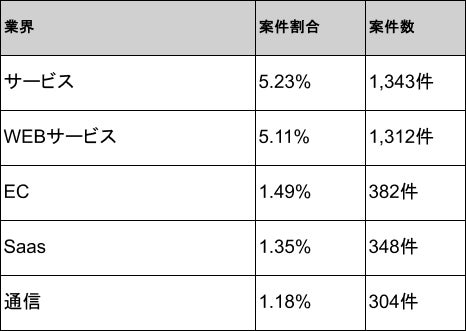 業界別では、サービスが5.23%、Webサービスが5.11%、ECが1.49%、SaaSが1.35%、通信が1.18%と、デジタルプロダクト領域に集中しています。