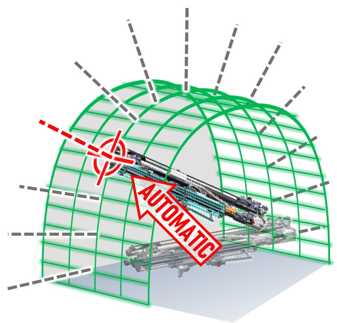「穿孔位置の自動位置合わせシステム」では、あらかじめ登録した設計穿孔位置データと、トータルステーションで計測した本体位置データから、「自動ロックボルト打設装置」の穿孔位置への誘導および打設角度の設定を自動で行います。これにより、作業員による穿孔位置のスプレーマーキング作業、オペレータによるブーム操作といった従来の作業が不要となり、省力化、さらには施工精度の確保および安全性の向上を実現しました。