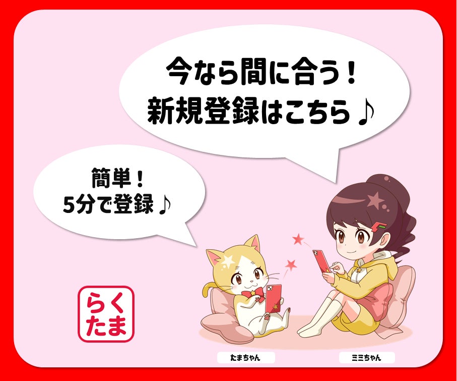 新規会員登録は、らくたまサイトにて5分程度のお手続きで可能です。その後の手続きに1~2日かかる場合もございますので、本日から7日間以内(12月14日まで)を目安に、ぜひ早めのご登録をお願いいたします。