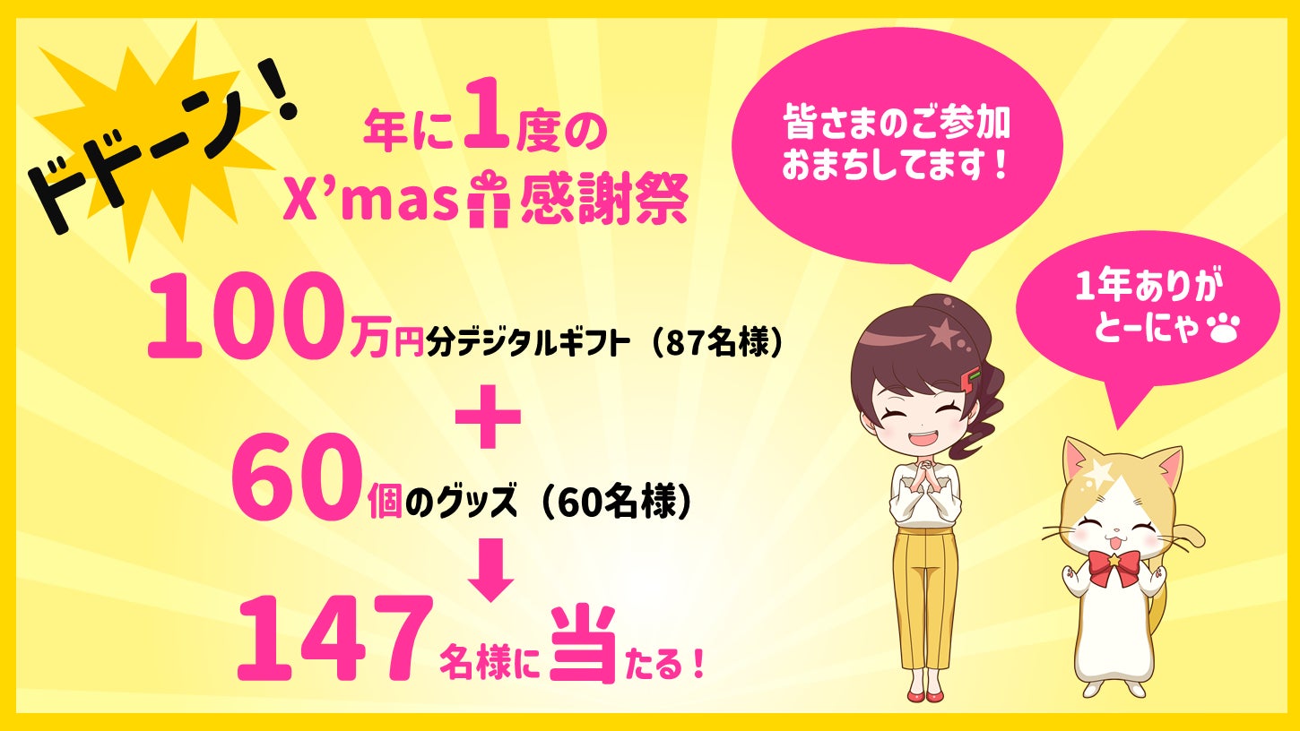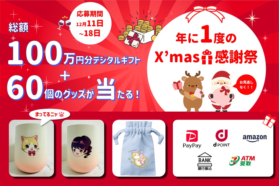 株式会社フロンティアグループは、総額100万円分のデジタルギフト&60個のグッズが当たる!『年に1度のX'mas感謝祭』の開催を発表いたしました。