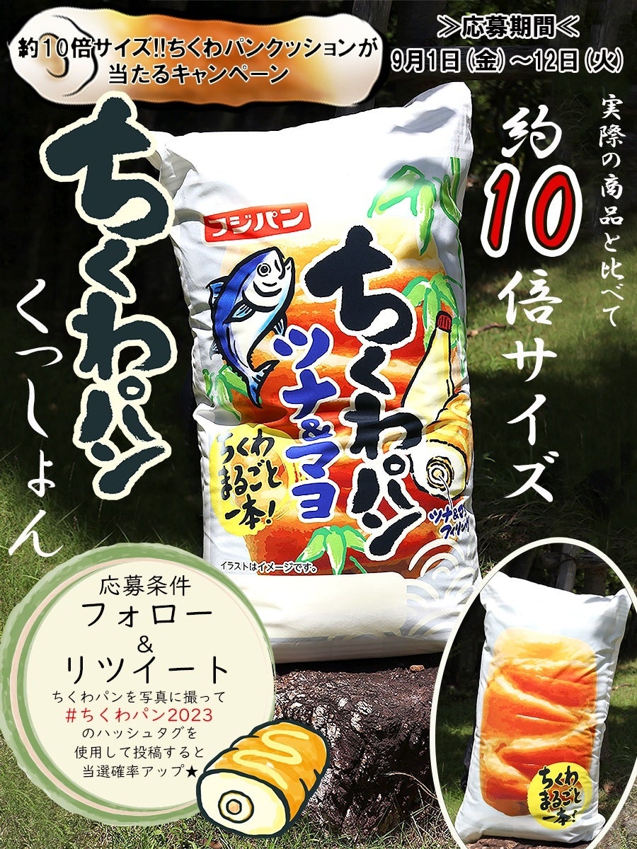 キャンペーン開催期間中、フジパン公式X(旧Twitter)をフォローし、キャンペーン投稿をリツイートすると抽選で10名様に通常のちくわパンの約10倍の大きさのオリジナルクッションをプレゼントします。