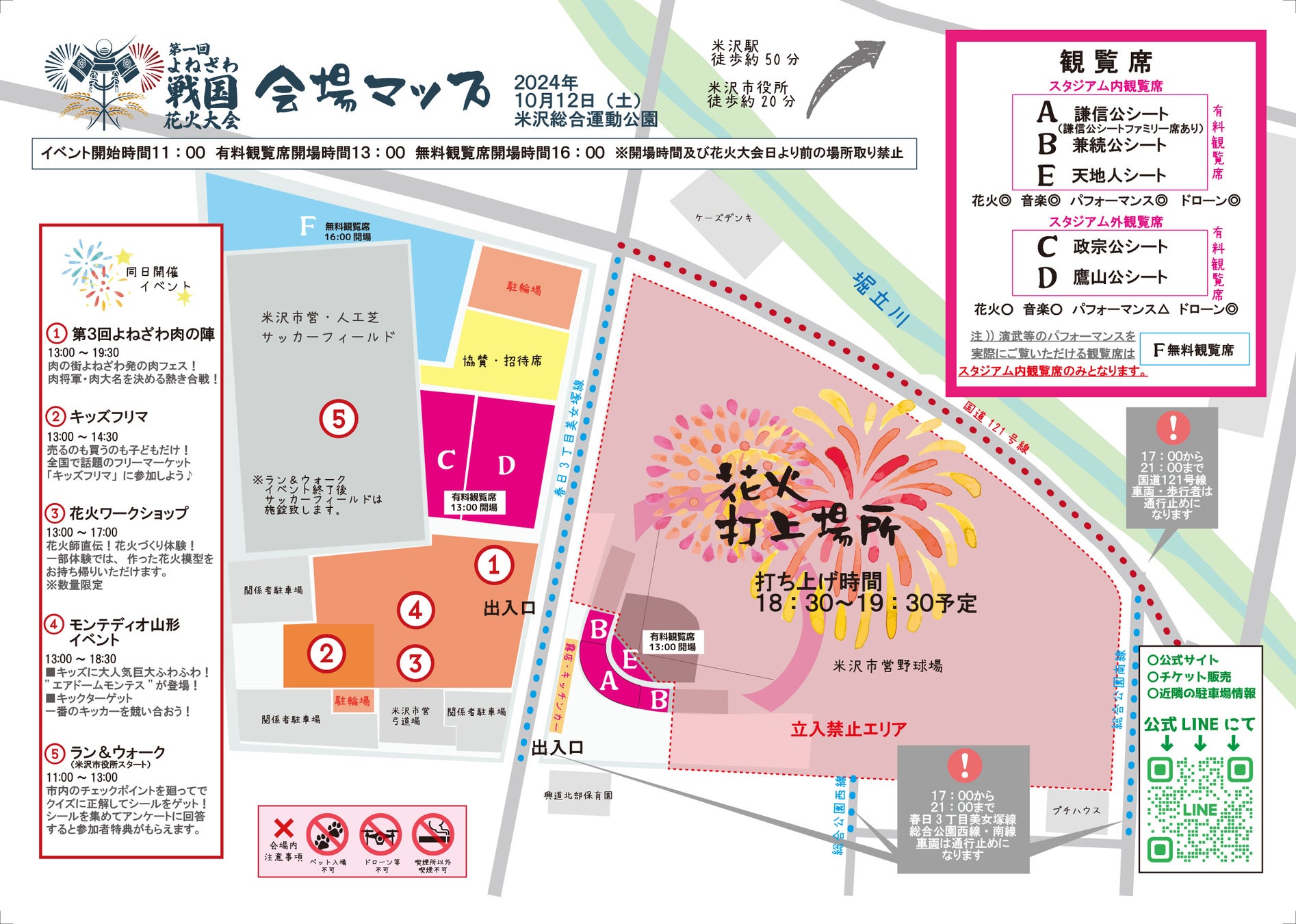 第1回よねざわ戦国花火大会 ■開催日 2024年10月12日(土) ■会場 花火大会 メイン会場 米沢市営野球場 花火大会 場外座席 米沢市営・人工芝サッカーフィールド 駐車場 各種イベント会場 米沢市営・人工芝サッカーフィールド 駐車場 他 ■開催時間 入場無料・各種イベント 11時00分 花火大会・有料席 開場 13時00分 花火大会・無料席 開場 16時00分 花火大会・開演 18時30分 ■ウェブサイト・SNS 公式サイト:https://sengokuhanabi.com 公式LINE:https://lin.ee/gOEkMEv 公式チケット販売サイト:https://eplus.jp/yonezawa_sengokuhanabi/ 公式X:https://x.com/sengokuhanabi 公式インスタグラム:https://www.instagram.com/sengokuhanabi/ ■主催・主管 米沢四季のまつり委員会/よねざわ戦国花火大会部会 ■参画団体 米沢市/米沢商工会議所/米沢観光コンベンション協会/米沢商工会議所青年部/米沢青年会議所/ 米沢観光コンベンション協会青年部 |