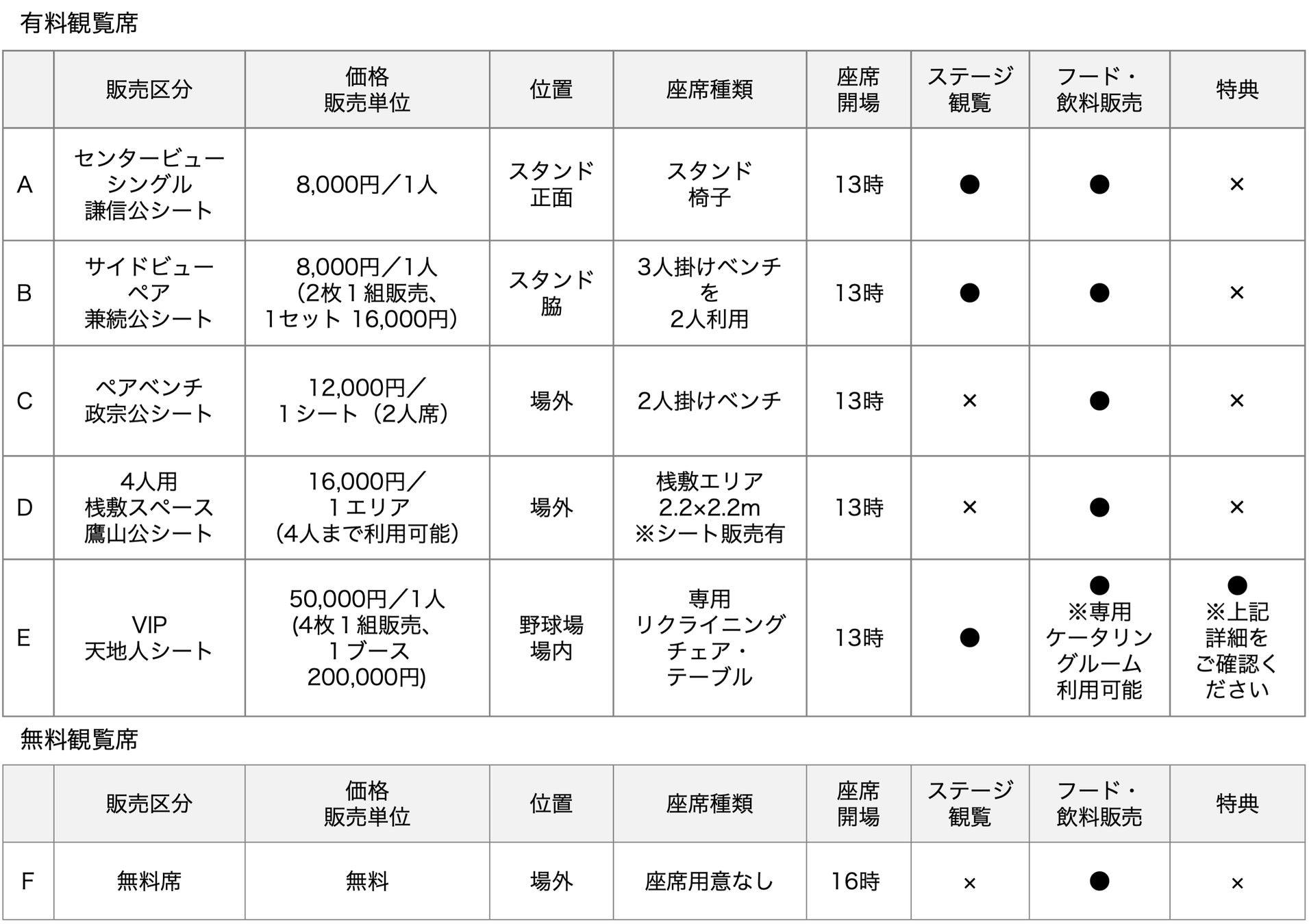 家族や友人と一緒にイベントをより快適に楽しむことができるよう、5エリアの有料観覧席をご用意しています。チケットは、公式チケット販売ページ(イープラス)、全国のファミリーマート、米沢市内4ヶ所の販売所にて購入可能です。