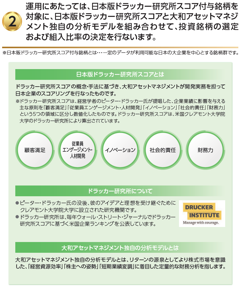 ※3 ドラッカー研究所スコア:ドラッカーの 5 つの原則にかかわる調査データに基づく米国企業のスコアリング。過去数年にわたりウォールストリートジャーナルにて毎年 12 月に公表している。大和アセットマネジメントは、ドラッカー研究所スコアの日本国内における独占使用契約を締結している。
