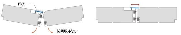 扉開放時は目板が扉に収納され、扉の閉鎖時にのみ目板がスライドして相じゃくりを形成する独自の新機構を備えた目板装置を採用しています。目板がスライドすることで、左右どちらの扉からでも開閉が可能です。