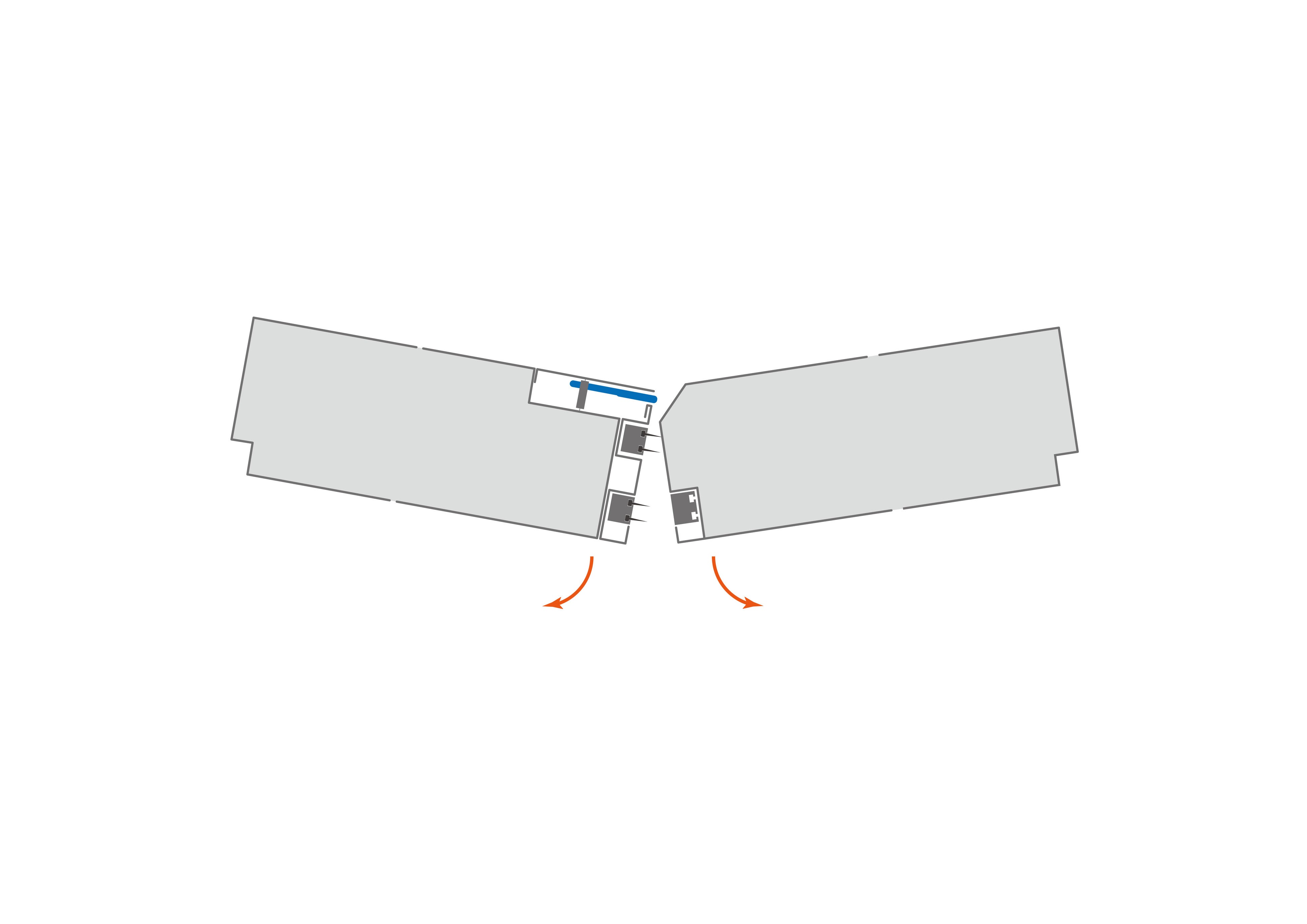 ホール向けドアは、火災時に大勢の人たちが避難するため、両開きで左右どちらの扉からでも開閉順序無しで操作できることが求められます。そのため、左右扉の召合せ部に相じゃくり構造※1とするための目板を設けることができず、特定防火設備として設置することが出来ませんでした。今回新たに発売する「防音ガード」ホール向けドアは、独自の新機構「デュアルオープンシステム」(特許申請中)により左右どちらの扉からでも開閉可能で、特定防火設備に適合します。さらに遮音等級もT-3を確保。安全性に加え、機能性も兼ね備えた高性能な防音ドアです。