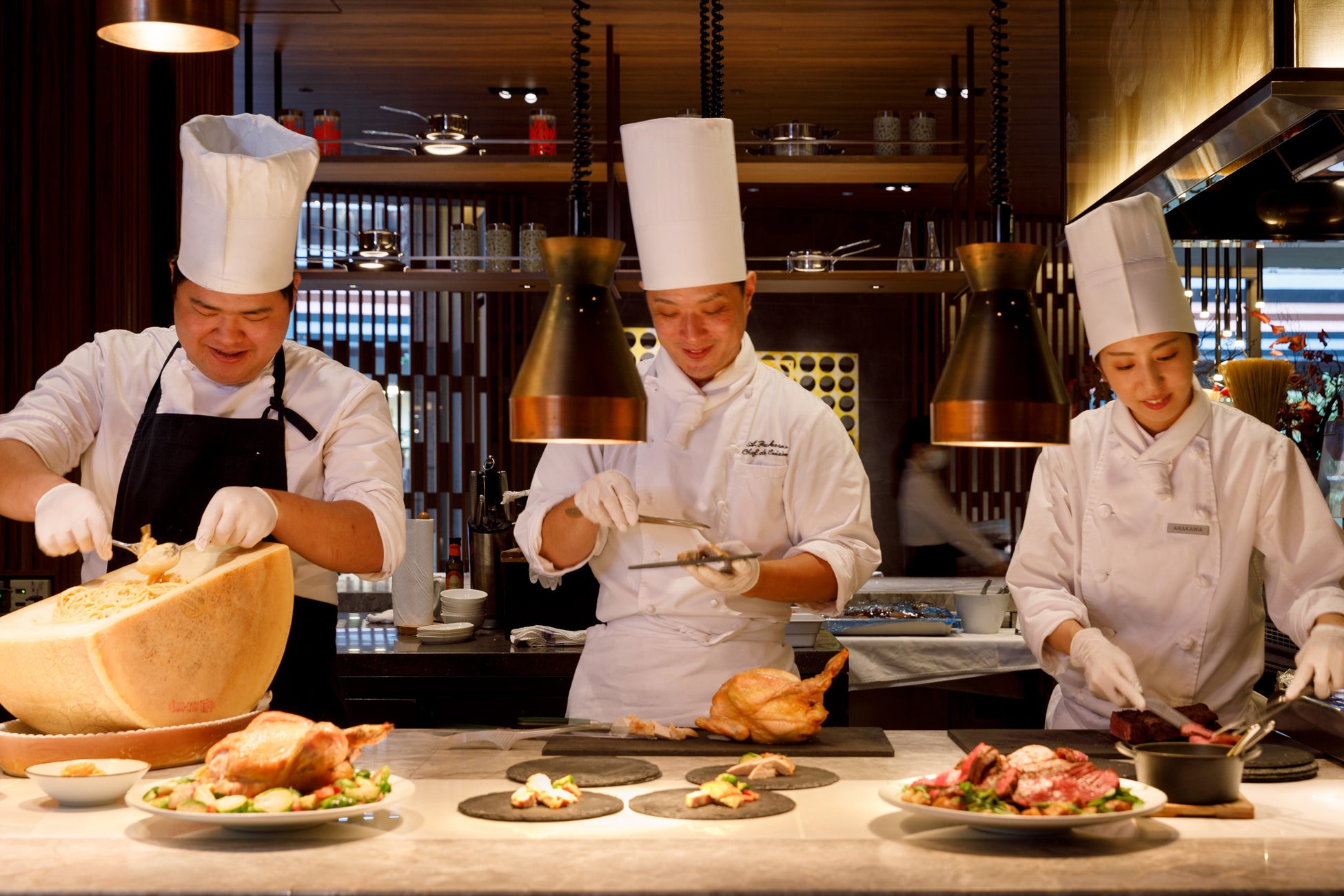 クリスマス目前の週末は、クリスマスディナービュッフェを2日間限定で実施。ライブキッチンから出来立ての料理を提供するシェフズステーションでは、切りたてのローストチキンやローストビーフをはじめ、パスタや糸島豚のグリルなどをご用意。デザートコーナーはシェフが目の前で仕上げる熊本県産和栗の絞りたてモンブランの他、苺のショートケーキやブッシュドノエル、シュトーレンなどクリスマス定番スイーツをはじめとするホリデーシーズンならではのデザートが並びます。また、フライドチキンやスパゲッティ ナポリタンなど、お子様向けの料理が並ぶキッズコーナーもご用意いたします。ファミリーや気の置けない仲間とともに、ライブ感あふれるワンランク上のクリスマスビュッフェをお楽しみください。