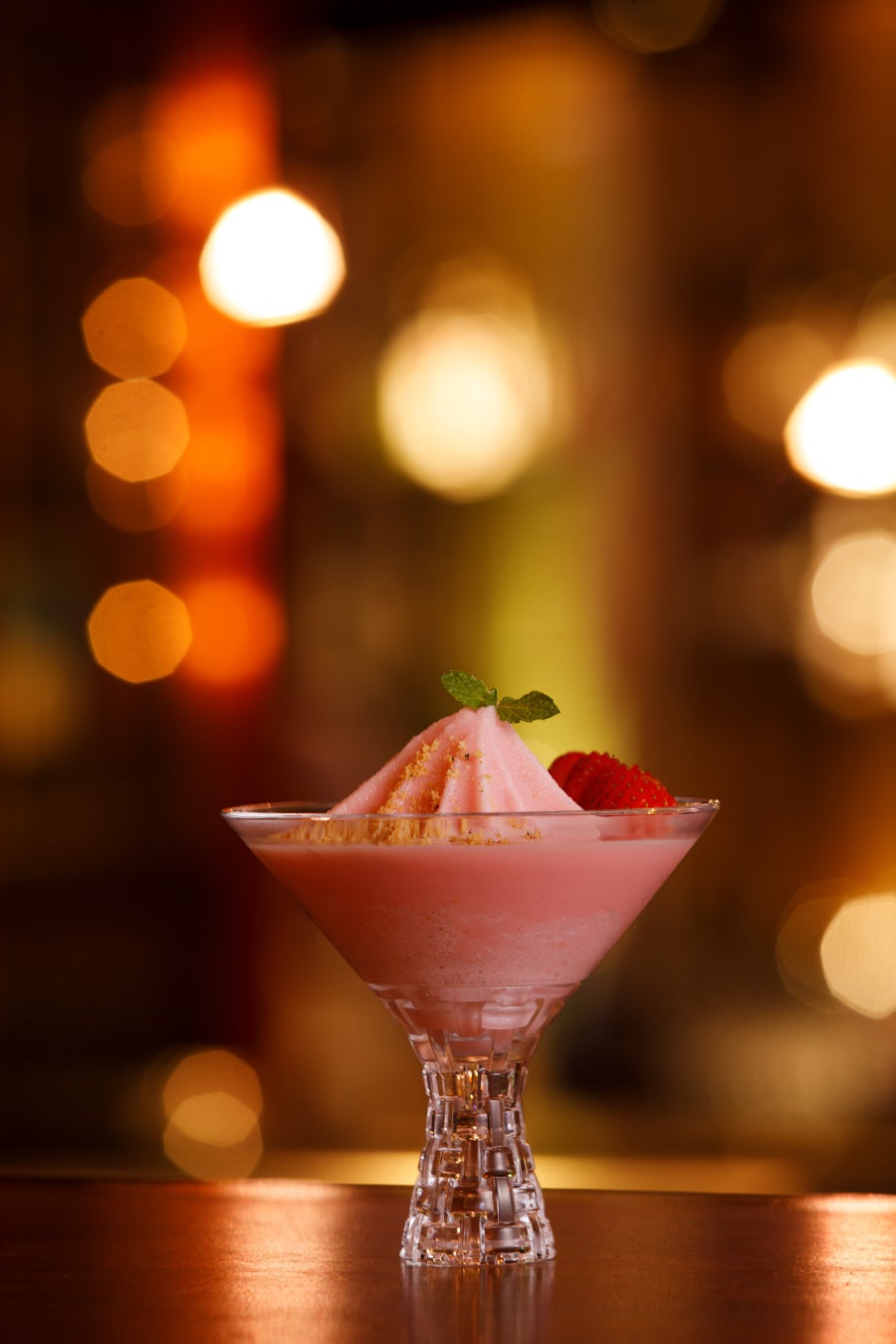 フレッシュな苺に、マスカルポーネとヨーグルトを重ね合わせた、まるでクリスマスケーキのようなデザートカクテル。苺の瑞々しい香りと、マスカルポーネのなめらかなコク、ヨーグルトの軽やかな酸味が織りなすハーモニーが、心までとろける冬のご褒美を演出します。ディナーのあとの余韻をホテルでゆっくりと楽しみたい夜にもぴったりの一杯です。