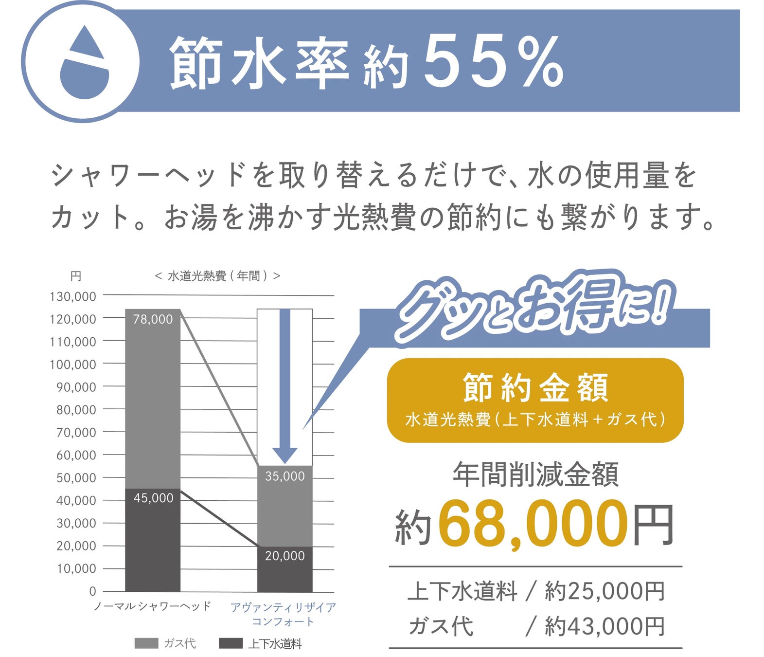 当製品は独自の特許技術「μ-Jet機構(※2)」によりファインバブルを発生させ、その過程で最大約55%(※3)の節水効果を発揮します。節約効果(上下水道料金+ガス料金)に換算すると年間約68,000円削減(※4)が見込めます。当社製品中、現状で最大の節約効果が期待できます。