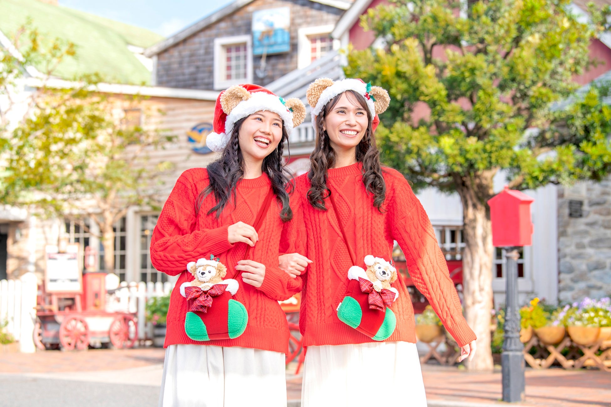 ひいらぎのアクセントがおしゃれなサンタクロースをイメージしたデザインのファンキャップや、大きな靴下の中からダッフィーが顔を出したデザインのショルダーバッグなど、身につければクリスマスムードが高まるグッズを販売します。