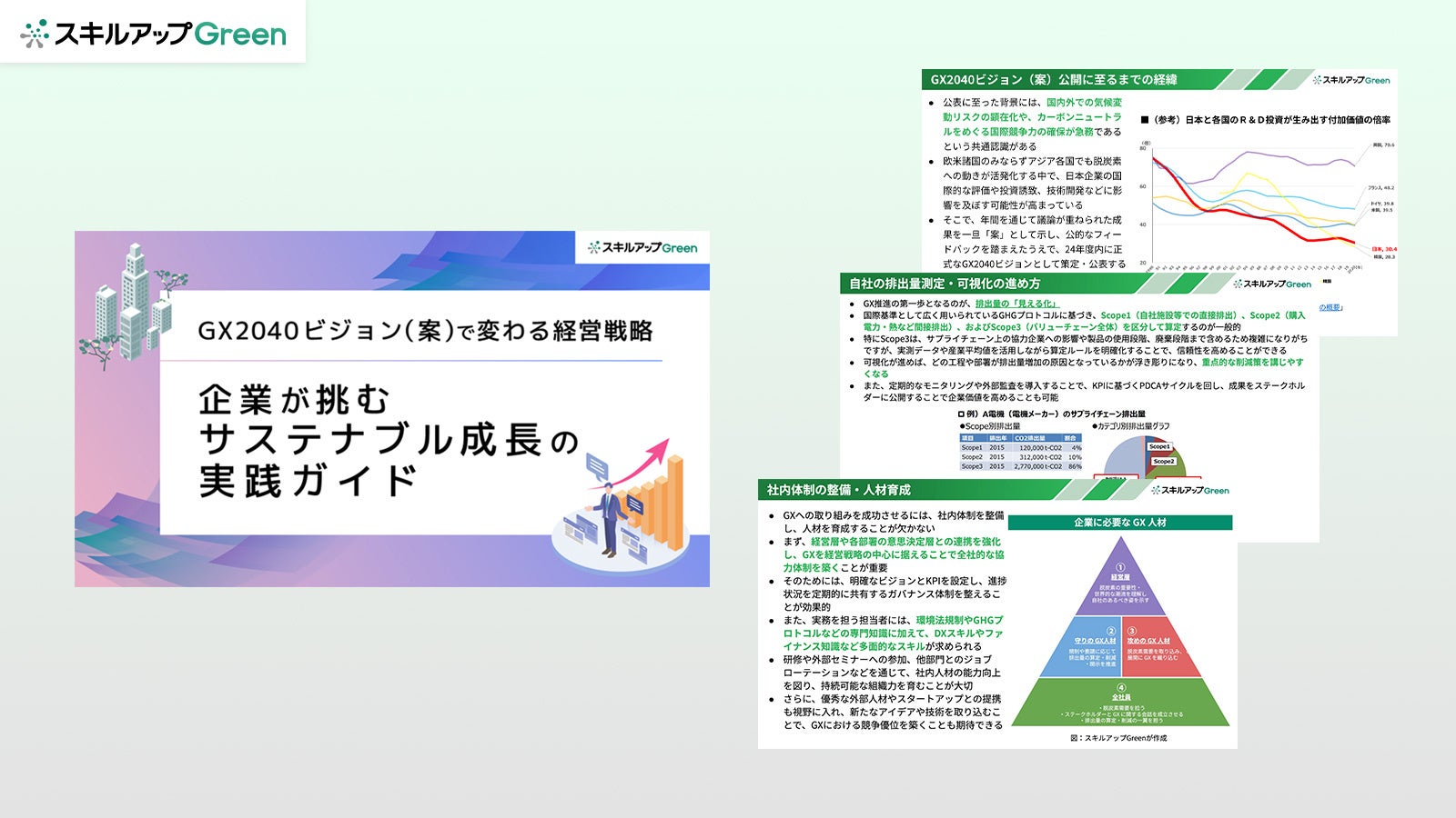 株式会社スキルアップNeXt(東京都千代田区、代表取締役 田原 眞一、以下「スキルアップNeXt」)は、2024年12月26日に政府から発表された「GX2040ビジョン(案)」のポイントを整理し、注目すべき政策の方向性や実務への影響をまとめたお役立ち資料『GX2040ビジョン(案)で変わる経営戦略:企業が挑むサステナブル成長の実践ガイド』を公開しました。