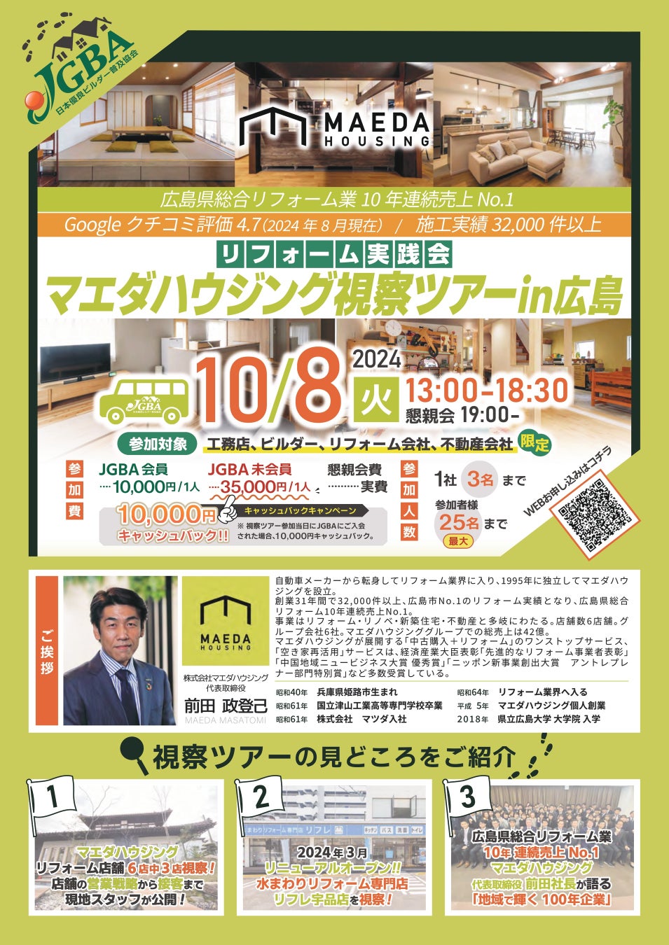 今回の視察ツアーはJGBA実践会シリーズの中でも大好評なリフォーム事業強化のための学びを発信するリフォーム実践会シリーズとして開催。開催企業は広島県総合リフォーム業10年連続売上No.1、Googleクチコミ評価4.7(2024年8月現在)、施工実績32,000件以上を達成した株式会社マエダハウジングで決定しており、同社の各事業店舗などを実際に視察する予定となっております。2024年10月8日(火)に開催が決定しており、会員企業に問わず全国の工務店、リフォーム会社が参加予定です。