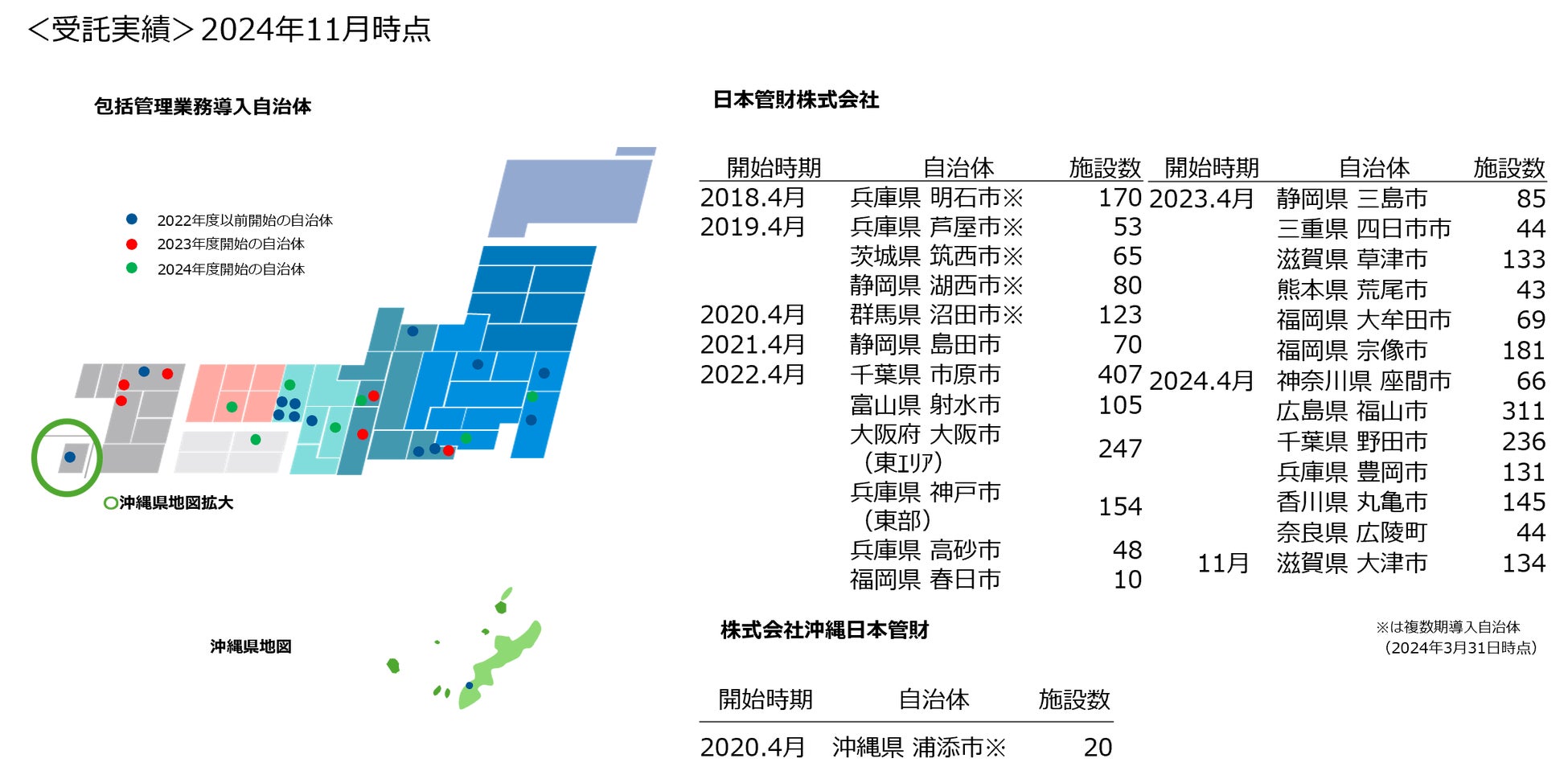 日本管財グループの包括管理業務の実績は、現在全国で26件となり、市場シェア率は約40%で業界トップ*です。2024年度からは、新たに7件(座間市・福山市・野田市・豊岡市・丸亀市・広陵町・新たに大津市が11月より開始)の地方公共団体で業務を開始しました。今後も全国的に包括管理を導入する自治体の増加が見込まれることから、これまでの実績や蓄積したノウハウを活かし、更なる事業の拡大に取り組んでまいります。