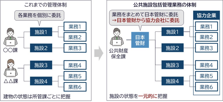 公共施設管理とは、地⽅公共団体が保有する公共施設の設備点検・修繕業務等を⼀括管理する管理方法です。施設の老朽化が課題となる中、建物や設備に関する保守点検や小修繕といった維持管理業務のマネジメント(契約、履行確認、支払い事務等)のほか、施設の巡回点検等を、施設管理の専門的知見を持つ民間事業者へ包括的に委託し、施設の安全性の向上や効率的な管理を目指すものです。民間の技術やノウハウを活用することで、管理品質の適正化、各業務における専門性の向上などが期待されています。