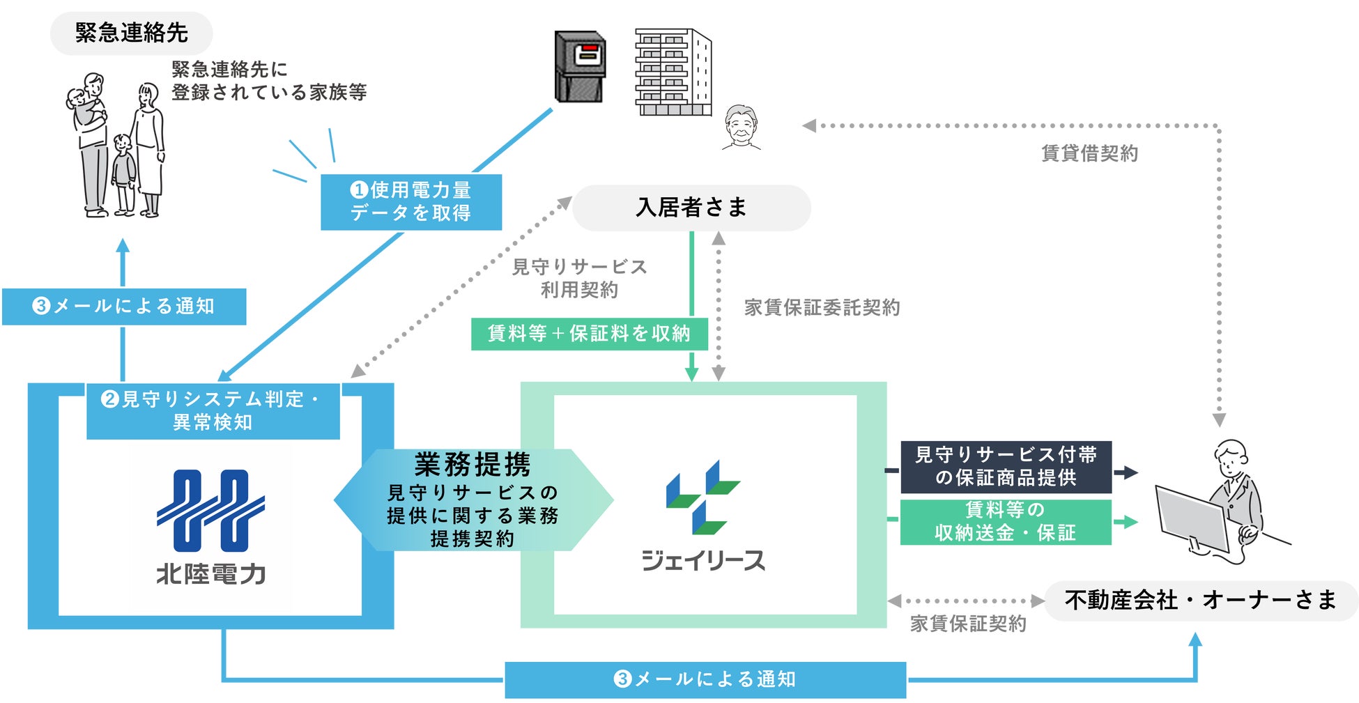 ジェイリース株式会社(本社:東京都新宿区・大分県大分市、東証プライム市場:7187、以下ジェイリース)は、北陸電力株式会社(東証プライム市場:9505 本社:富山県富山市、以下北陸電力と表記)と業務提携し、北陸電力が提供する使用電力量データを活用した入居者見守りサービスを付帯した保証サービス「電気でつながりサポート」の提供を開始したことをお知らせいたします。