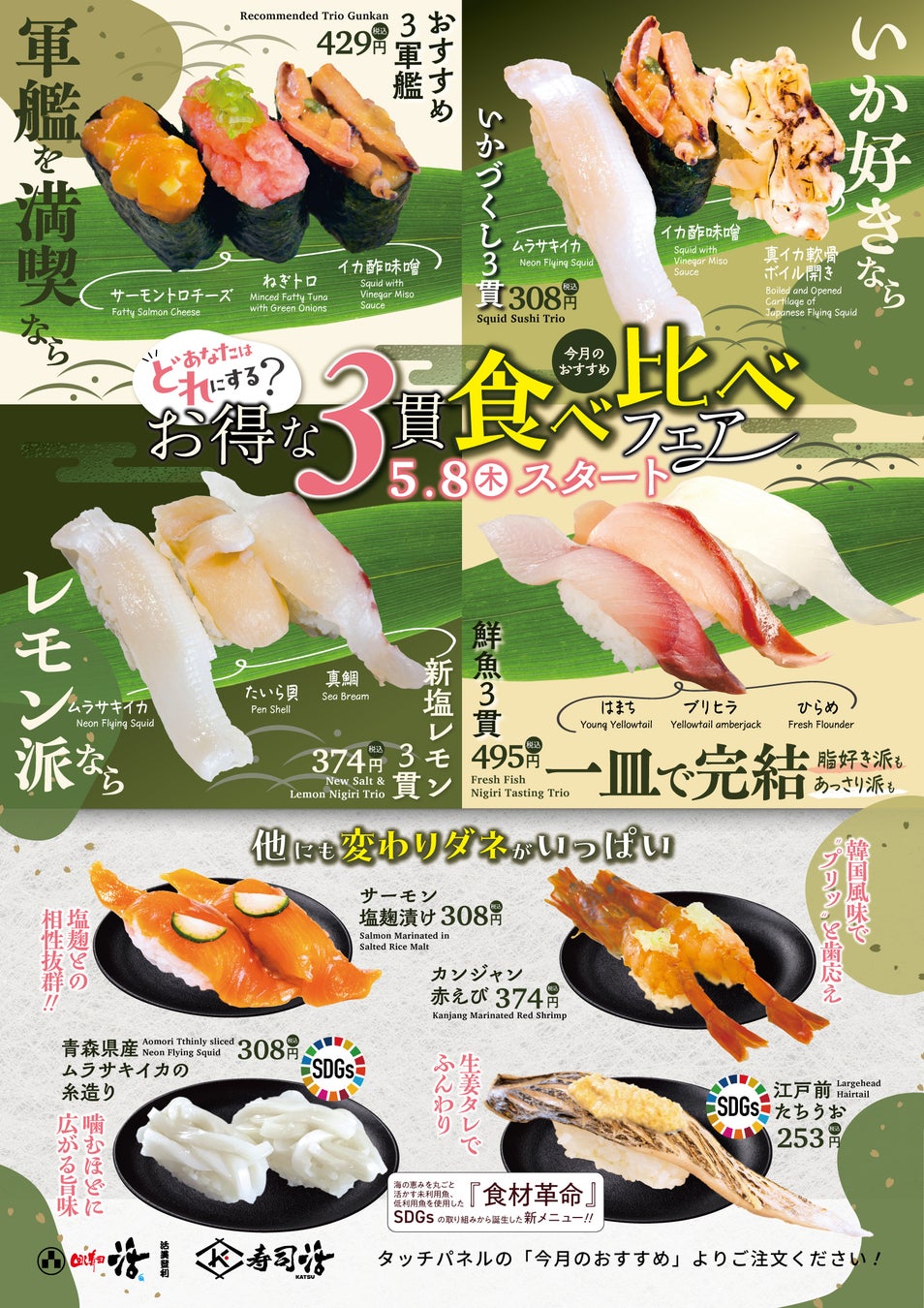 株式会社活美登利(本社:東京都品川区、代表取締役社長:土屋秀仁)が運営する「回し寿司活/寿司活」は、運営店舗全店で5月8日(木)より初夏の季節限定メニューとして「3貫食べ比べフェア」を開催いたします。