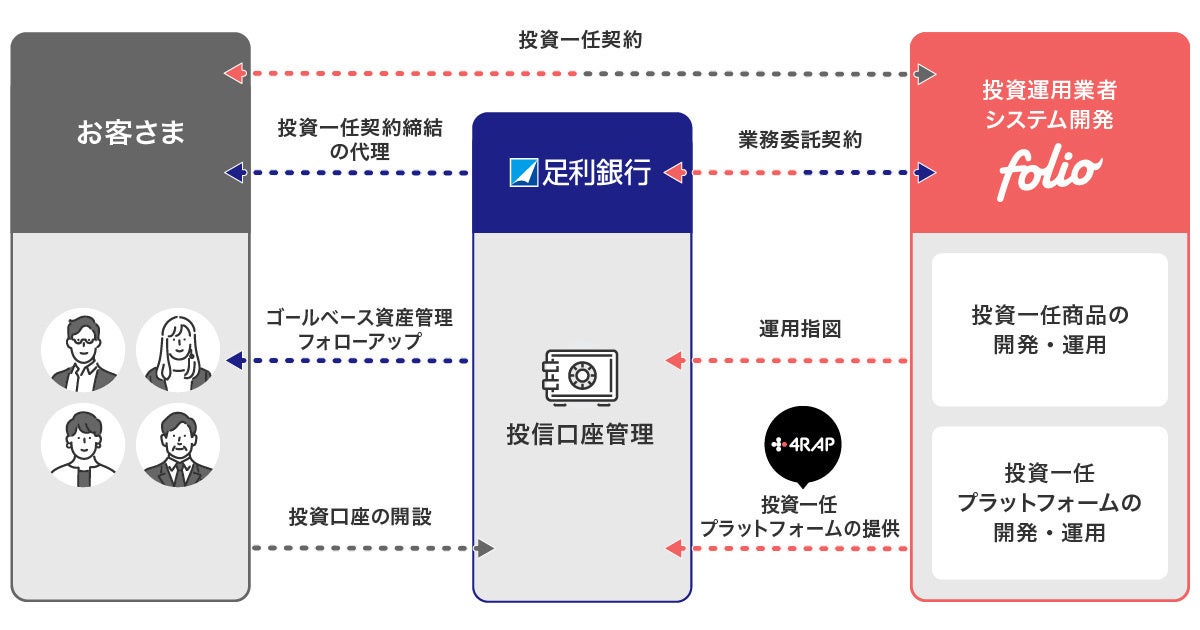 SBIグループで革新的な金融ソリューションを提供する株式会社FOLIOホールディングスの子会社である株式会社FOLIO(本社:東京都千代田区、代表取締役:四元 盛文、以下:「FOLIO」)は、株式会社足利銀行(本社:栃木県宇都宮市、頭取:清水 和幸、以下:「足利銀行」)のお客さま向けにFOLIOの投資一任プラットフォーム「4RAP(フォーラップ)」を活用したファンドラップサービス「あしぎん投資一任サービス STORY」を2025年6月6日から提供開始いたします。