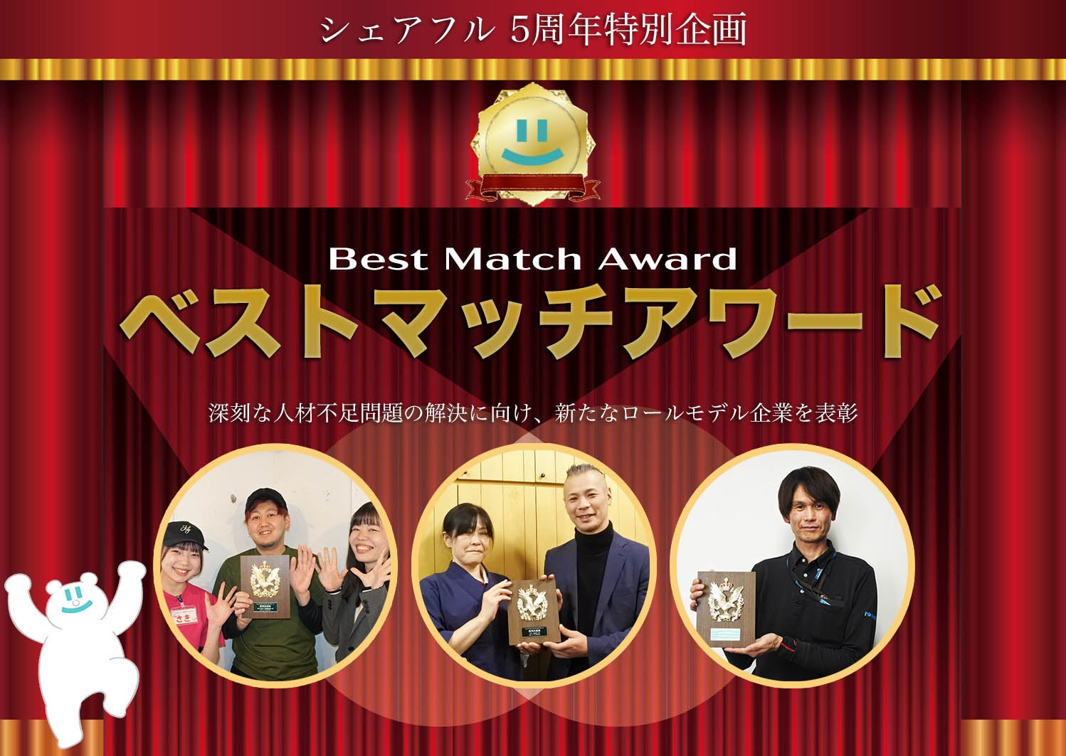 今回は、シェアフルサービス開始5周年記念として「ベストマッチアワード」と題し、『シェアフル』をご利用いただいている多くの企業・店舗様の中から、3社を表彰させていただきました。