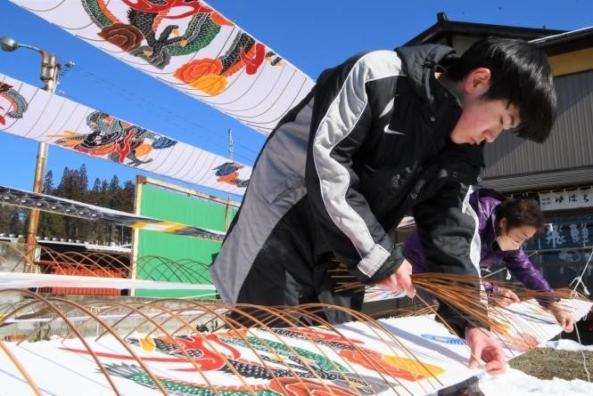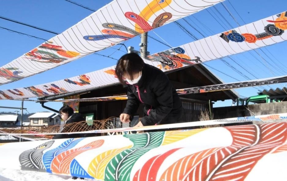 高山市で唯一、祭衣装を手掛ける染物店「ゆはら染工」では、年明けから飛騨染の作業を開始し、1月30日(火)より寒ざらしの作業に取り掛かりました。太陽の日差しが降り注ぐ中、従業員5人で雪の積もった干し場で竹ひごを使い、 竜や鳳凰などが描かれた生地(反物)をピンと張ってしわを伸ばします。