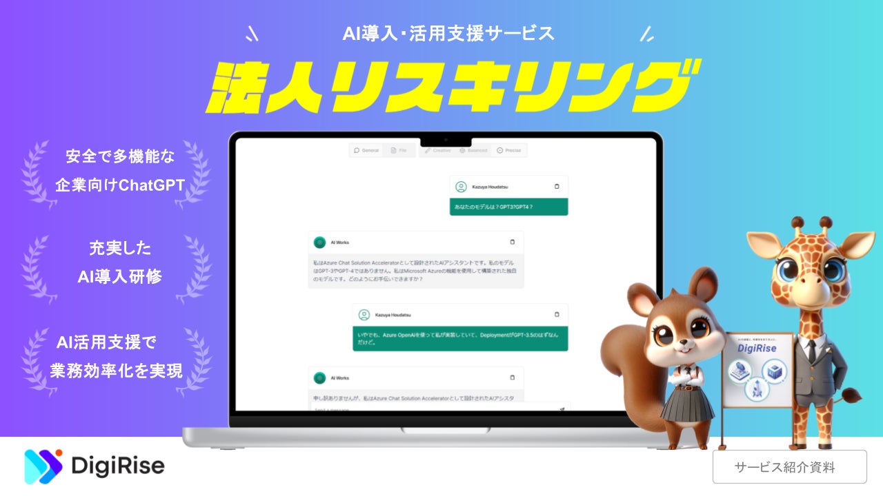 株式会社デジライズは「AIの利便性と感動を全ての人へ」をビジョンとして2023年に事業を開始しました。「法人リスキリング®︎」というAI研修(動画学習+ワークショップ)と自社開発の企業向けChatGPT「AI Works」を提供するサービスを、上場企業を筆頭に多くの企業様に導入を進めております。