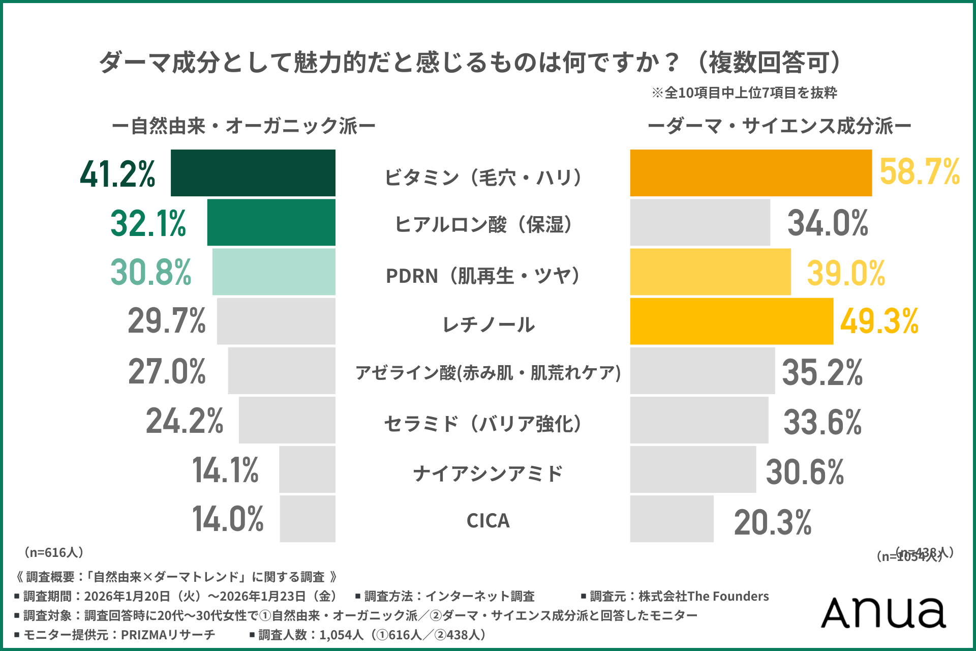 株式会社The Foundersが販売する化粧品ブランド「Anua(アヌア)」(https://anuashop.jp/)は、20代~30代女性で①自然由来・オーガニック派/②ダーマ・サイエンス成分派の方を対象に、「自然由来×ダーマトレンド」に関する調査を実施しました。