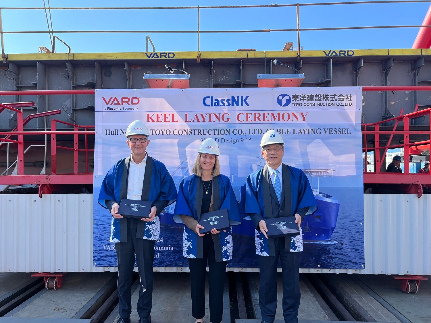 東洋建設株式会社(代表取締役社長執行役員COO:中村 龍由、本社:東京都千代田区、以下「当社」)は、9月24日、Vard Group AS*1(COO:Eric Sandnes 、ノルウェー)と建造契約を結んでいる自航式ケーブル敷設船(以下「本船」)の起工式(Keel Laying *2)を、両社関係者らが見守るなか、ルーマニアの同社造船所で執り行いました。これにより、本船は本格的な建造ステップへ進むこととなり、2026年度上期の完成に向けて計画が予定どおり進捗していることをお知らせいたします。