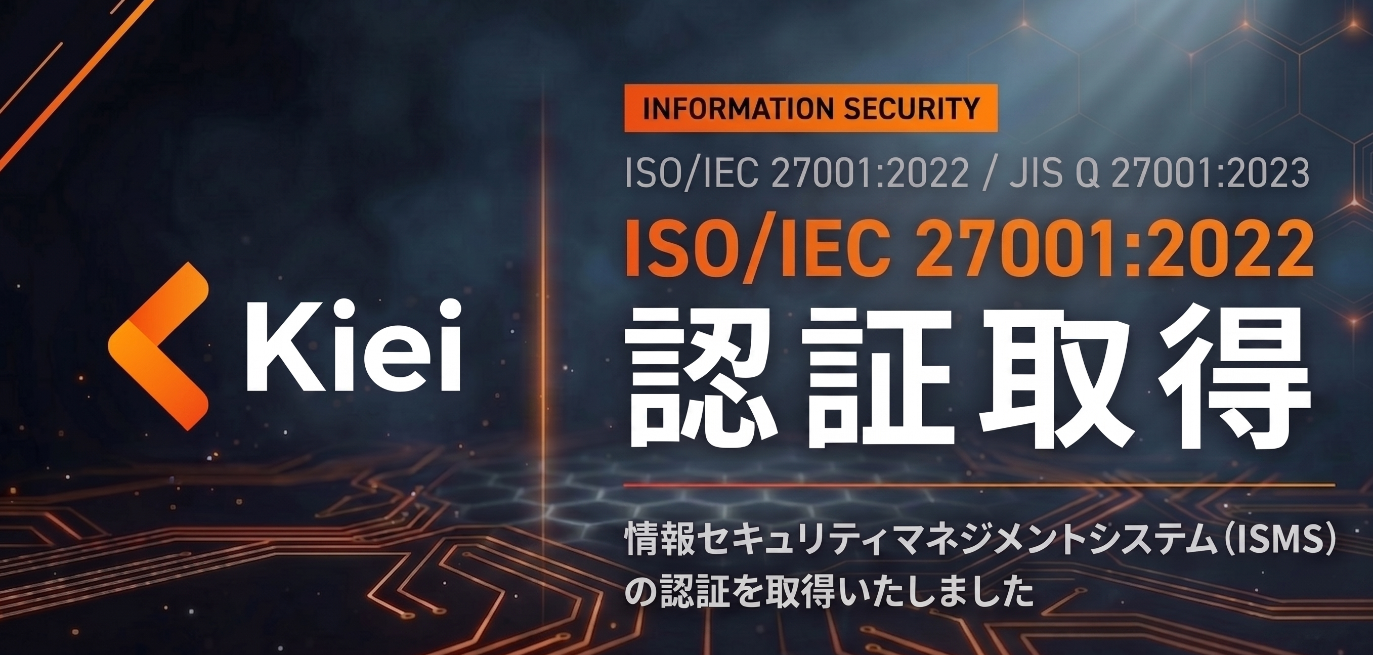 株式会社Kiei(本社:東京都港区、代表取締役:佐久間耀大)は、2026年3月16日付で、情報セキュリティマネジメントシステム(ISMS)の国際規格である「ISO/IEC 27001:2022」の認証を取得したことをお知らせいたします。