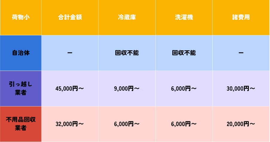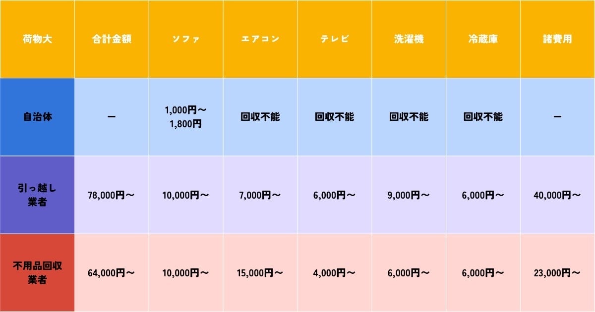不用品の処分にはどれくらいの費用がかかるのか。また、処分する際の相場を知りたいという方に向けて、相場比較表を作成しました。