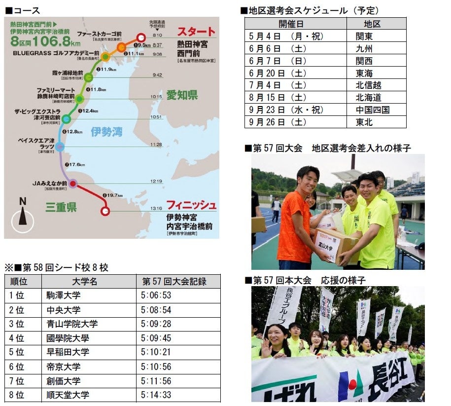 本大会は、「東京箱根間往復大学駅伝競走(箱根駅伝)」、「出雲全日本大学選抜駅伝競走(出雲駅伝)」とともに「学生三大駅伝」のひとつに数えられています。1970年の初開催以来、今年で58回目を迎える伝統ある大会で、全国8地区の代表17校、シード校8校、日本学連選抜、東海学連選抜の合計27チームが出場し、名実ともに真の「大学駅伝日本一」を競います。