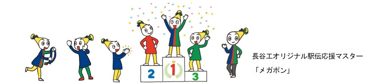 長谷工は、協賛当初より応援テーマを“選手、がんばる!社員、がんばる!みんなでつくる、手づくり駅伝”と掲げています。地区選考会および本大会には、延べ約500名の社員が全国から応援に駆け付け、社員一人ひとりの想いを集結して大会を盛り上げます。また、毎年好評をいただいている駅伝応援ミネラルウォーターは、汎用および地区選考会それぞれのボトルラベルを一新し、長谷工オリジナル駅伝応援マスター「メガポン」を採用しました。また、今年もボトルのミニキーホルダーを作製し、駅伝応援ミネラルウォーターとともに全ての出場チームにお届けします。