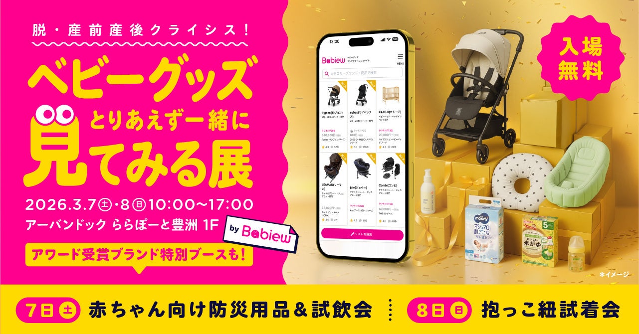 今最も参考にされている(※)ベビーグッズの口コミサイト「Babiew(べビュー)」を運営するBEFFY株式会社(本社:東京都渋谷区、代表取締役CEO:金木 りな)は、2026年3月7日(土)から8日(日)の2日間、アーバンドック ららぽーと豊洲 1階 ZARA前エリアにて、リアルイベント「脱・産前産後クライシス!ベストベビーグッズとりあえず一緒に見てみる展 by Babiew」を開催いたします。