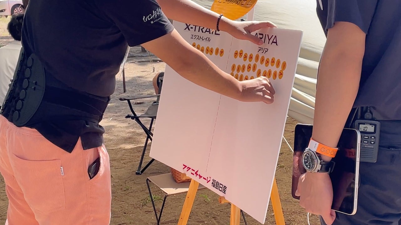 福島日産自動車株式会社(以下福島日産と略、本社:福島県福島市、代表:金子 與志幸)は、2024年7月19日(金)~21日(日)に猪苗代町天神浜オートキャンプ場にて開催された「GOOUT CAMP in 猪苗代」(主催:GO OUT CAMP 猪苗代実行委員会)への特別協力・特別出展を行いました。福島日産の特別ブースでは、日産アリア・エクストレイルの砂浜特別試乗比較体験、車中泊の新しいカタチを提案した「キャラバン MYROOM」の展示、福島日産の商品・サービス・活動でふくしまに元気をチャージする意味が込められた企業メッセージ「フクニチャージ」の頭文字「フ」をあしらったマシュマロの配布などを行いました。日産アリア・エクストレイルの砂浜特別試乗比較体験には50組(約200名)を超える方が参加し、スタックしやすい砂浜環境での力強い走りや走行制御、それぞれの車種の特長を福島日産のカーライフアドバイザーの説明を受けながら試乗体感しました。