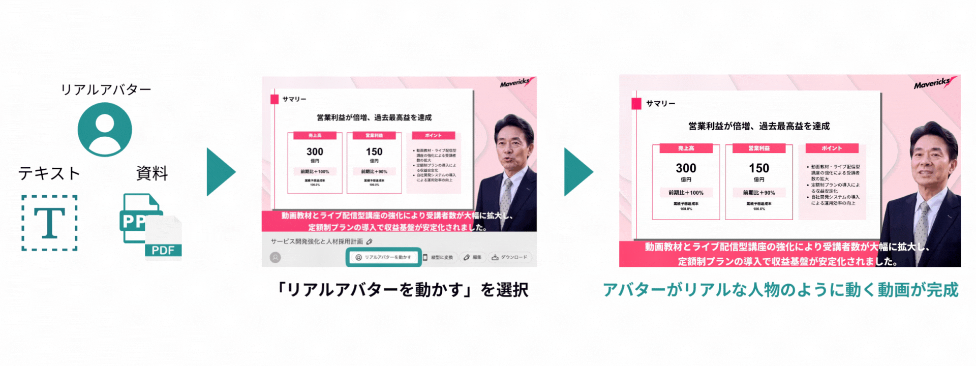 日本発、動画生成AI「NoLang(ノーラン)」を提供する株式会社Mavericks(本社:東京都文京区、代表取締役社長:奥野 将太)は、写真1枚から本人の姿を再現する「リアルアバター機能」を新たに搭載し、提供を開始いたしました。本機能は、わずか1枚の写真から、動画上で滑らかに動作するリアルアバターを生成します。ビジネスシーンにおける研修やIR、広報・PR動画へ実在の人物のアバターを登場させることで、視聴者への親近感を高め、より深い信頼の醸成を実現します。