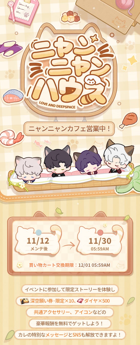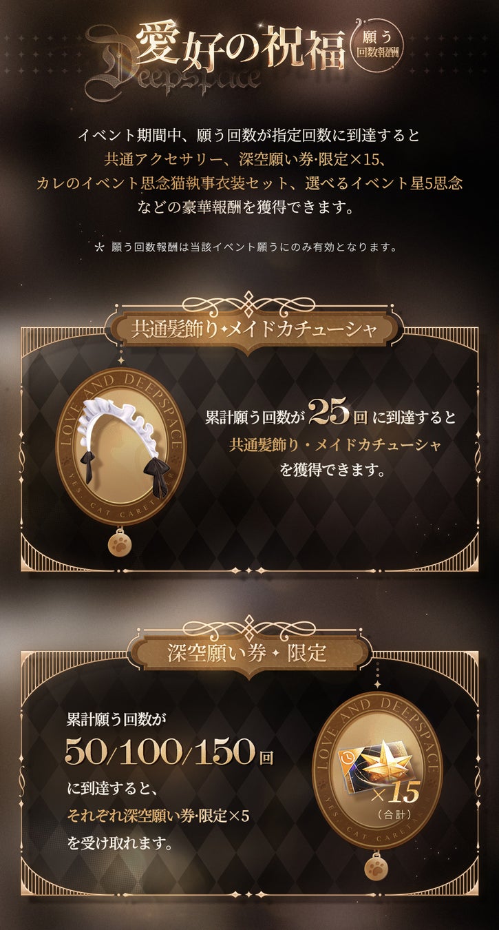 イベント説明:イベント期間中、累計願う回数が指定の回数に到達すると、共通髪飾り【メイドカチューシャ】、【深空願い券・限定×15】、カレのイベント思念猫執事衣装セット、選べる【当期イベント限定星5思念】などの豪華報酬を獲得できます。