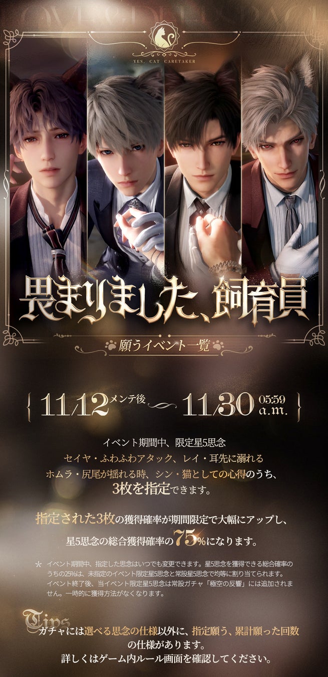 イベント説明:イベント期間中、限定星5思念【セイヤ・ふわふわアタック】【レイ・耳先に溺れる】【ホムラ・尻尾が揺れる時】【シン・猫としての心得】のうち、3枚を指定できます。指定された3枚の獲得確率が期間限定で大幅にアップし、星5思念の総合獲得確率の75%を占めます。