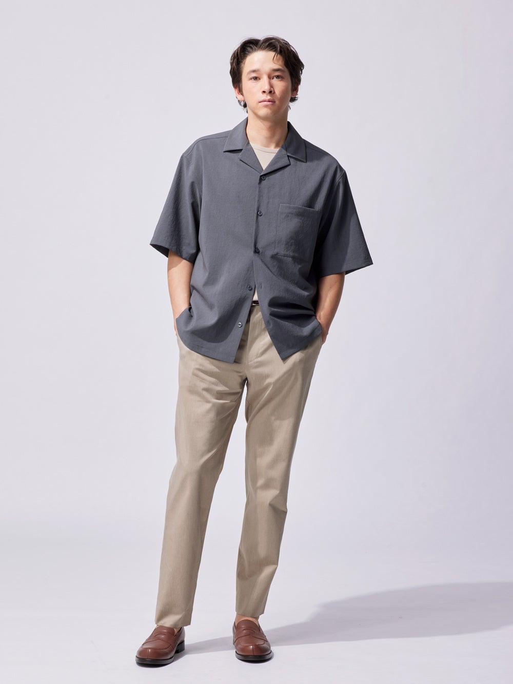 「プレシャスドライオープンカラーシャツ」は襟もとが開いたデザインでリラックス感があり、春夏のカジュアルスタイルにおすすめの1枚です。一般的なオープンカラーシャツよりも首元の開きが大きすぎず、コンパクトなデザインになっているため、きちんと見せたいオフィスでも活躍します。