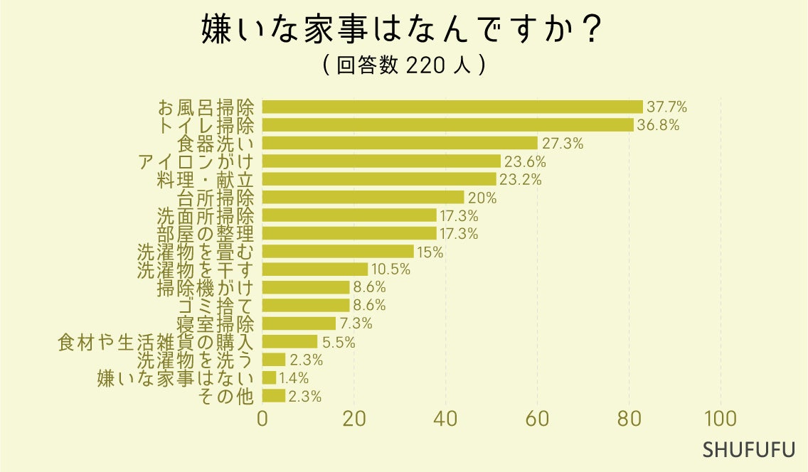 嫌いな家事はなんですか?の問いに対して最も多かったのが「お風呂掃除(37.7%)」でした。 次いで「トイレ掃除(36.8%)」「食器洗い(27.3%)」という結果でした。「嫌いな家事はない」と答えた人は「1.4%」いました。ほとんどの人が何かしらの家事を嫌っているようです。