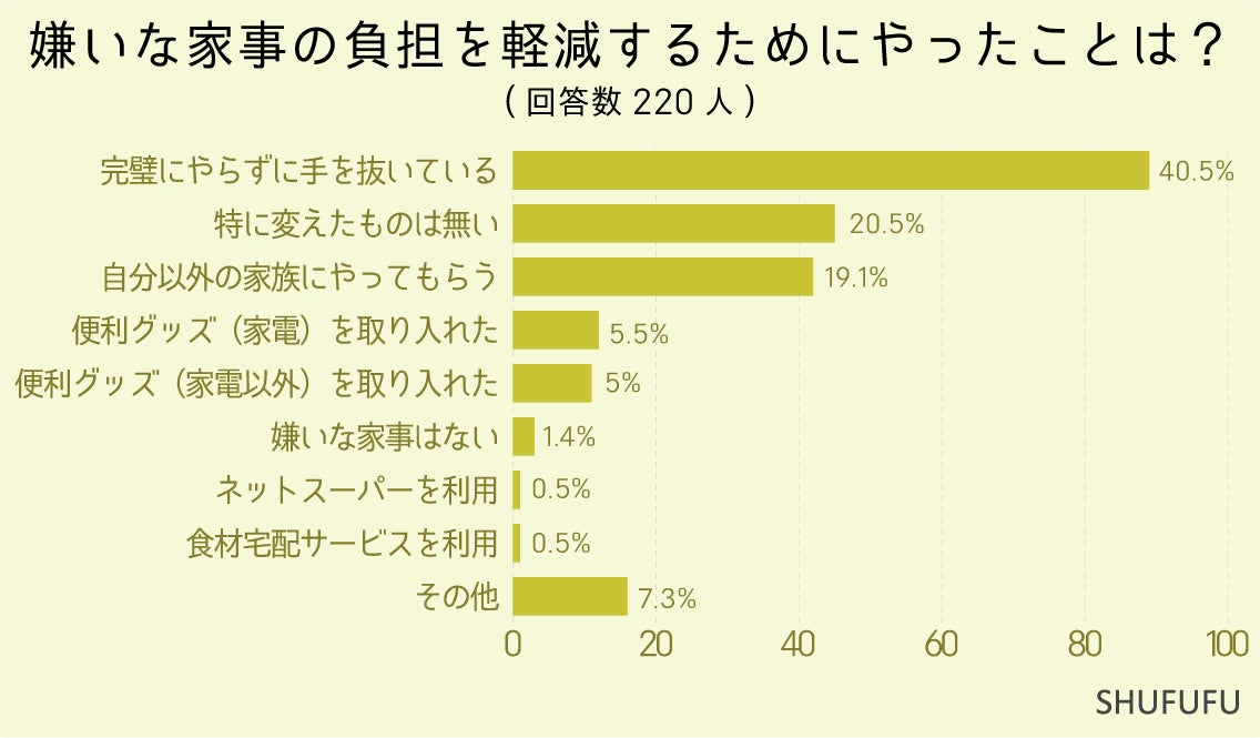 嫌いな家事の負担を軽減するためにやったことは?の問いに対して最も多かったのが「完璧にやらずに手を抜いている(40.5%)」でした。 次いで「特に変えたものは無い(20.5%)」「自分以外の家族にやってもらう(19.1%)」という結果でした。 嫌いではあるものの現状維持をしている人も5人に1人いるようです。