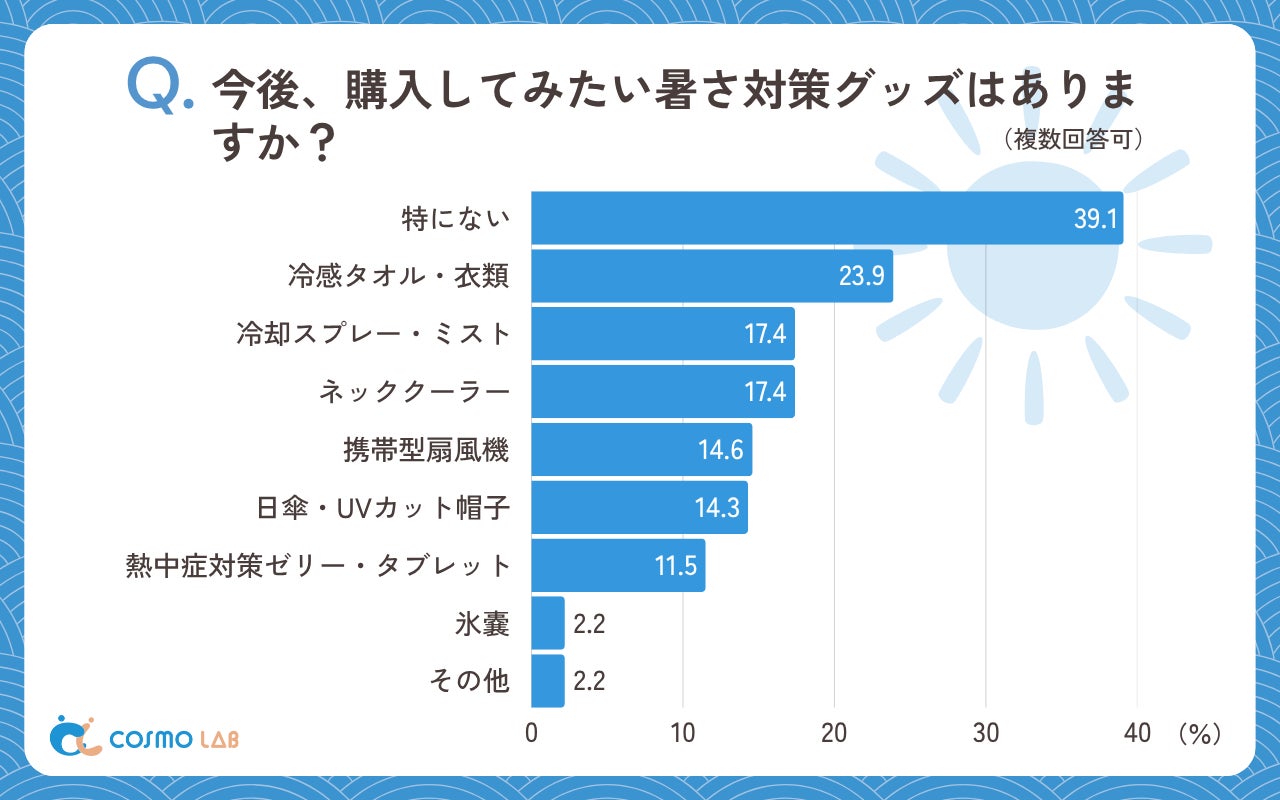 「特にない」(39.1%)が最多でありつつ、「冷感タオル・衣類」(23.9%)、「冷却スプレー・ミスト」(17.4%)などへの購入意欲も確認されました。特に価格が安く、手軽に使えるアイテムにニーズが集中しています。現在の対策に満足している層が多い一方で、新たなグッズへの関心も一定数存在します。