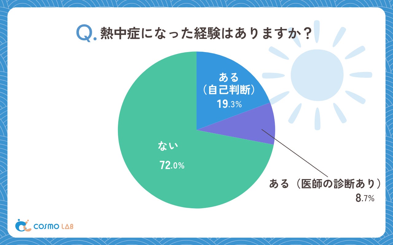 「ない」と回答した人が72.0%と最多であり、多くのシニアは熱中症の自覚経験がないことが窺えます。一方で「ある(自己判断)」は19.3%、「ある(医師の診断あり)」も8.7%おり、約3割の人が何らかの体調異変を認識しています。医師診断を受けた人の割合も一定数存在することから、症状を軽視せずに医療機関へ相談する行動が一部で浸透していると考えられます。