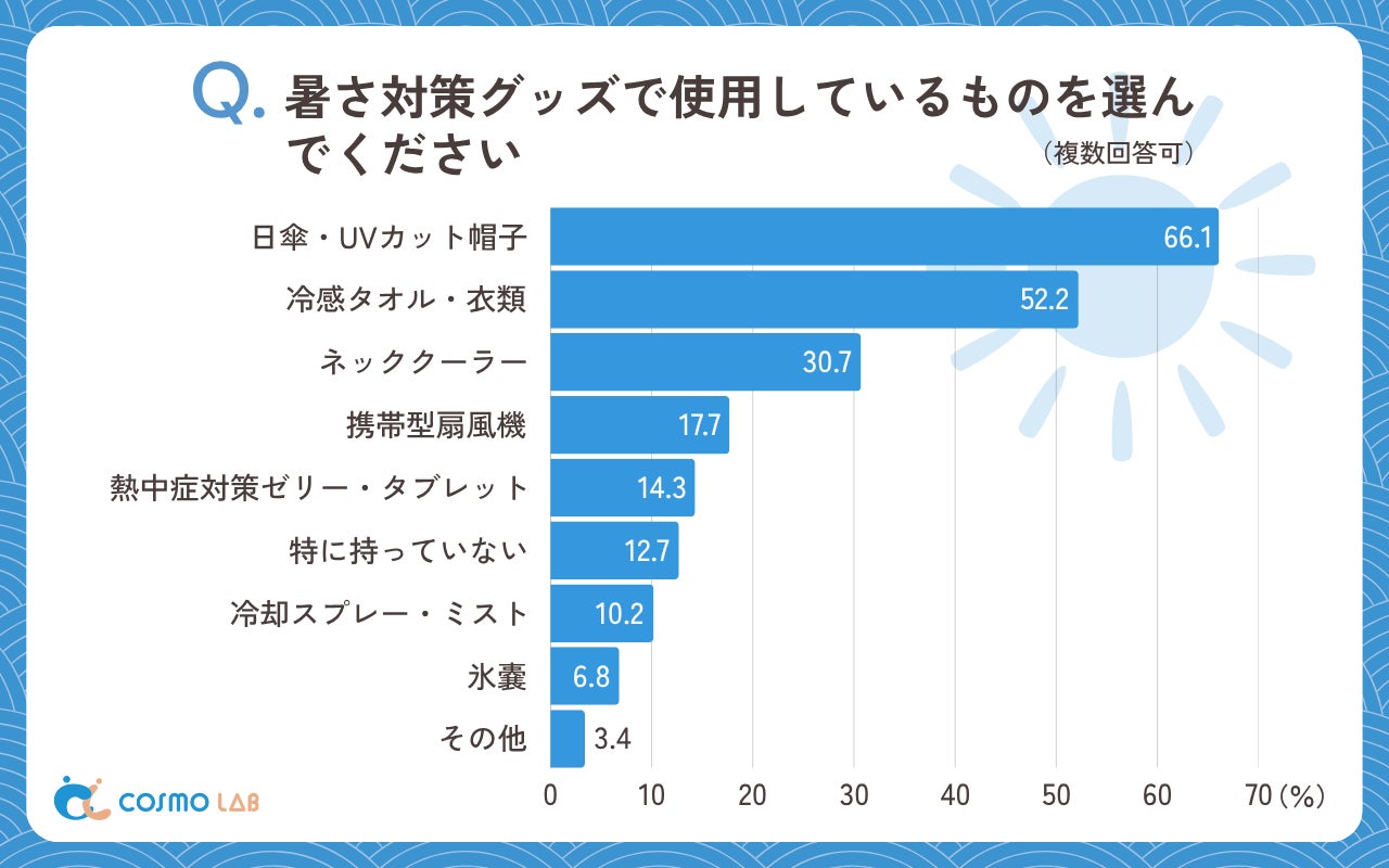 「暑さ対策グッズで使用しているもの」では「日傘・UVカット帽子」が66.1%と最も多く、外出時の対策が重視されています。手軽で効果的なアイテムとして定着していることが分かります。