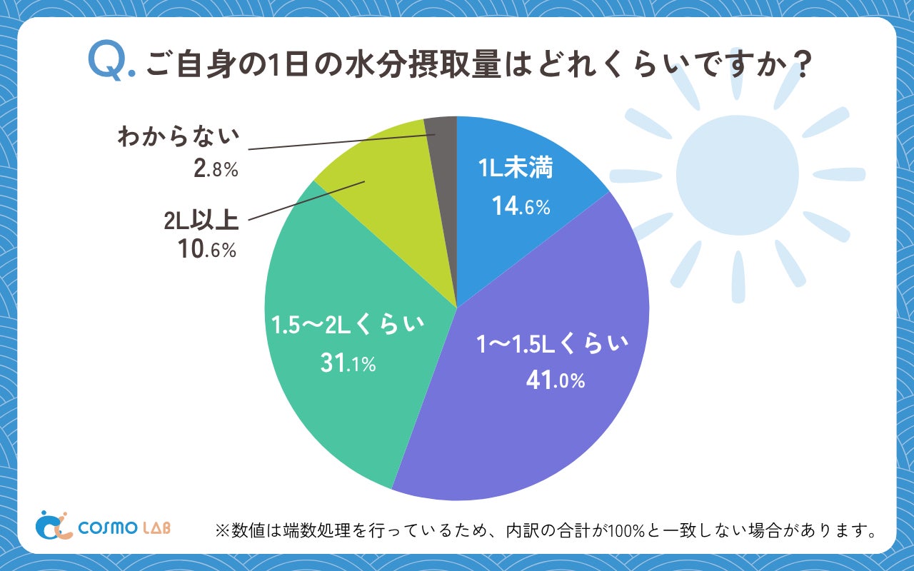 「1〜1.5Lくらい」が41.0%で最多で、「1.5〜2Lくらい」(31.1%)と合わせて7割以上が1L以上を摂取しています。「1L未満」は14.6%と一定数存在し、年齢や活動量に応じた摂取行動の個人差が見られます。推奨量の再周知が求められます。