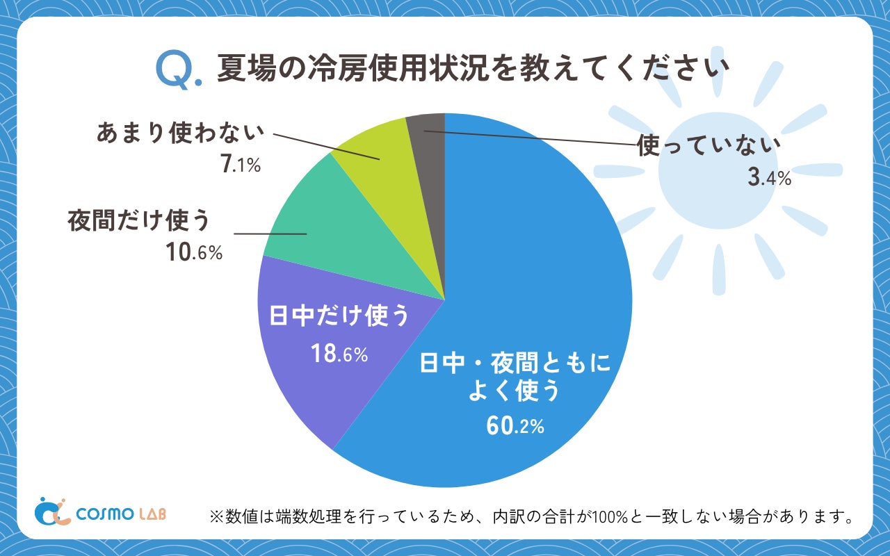 「日中・夜間ともによく使う」が60.2%と圧倒的多数を占めました。次に「日中だけ使う」(18.6%)、「夜間だけ使う」(10.6%)が続いており、生活リズムや家計への配慮が窺えます。一方、「あまり使わない」「使っていない」といった冷房の使用に消極的な層はごく少数にとどまります。