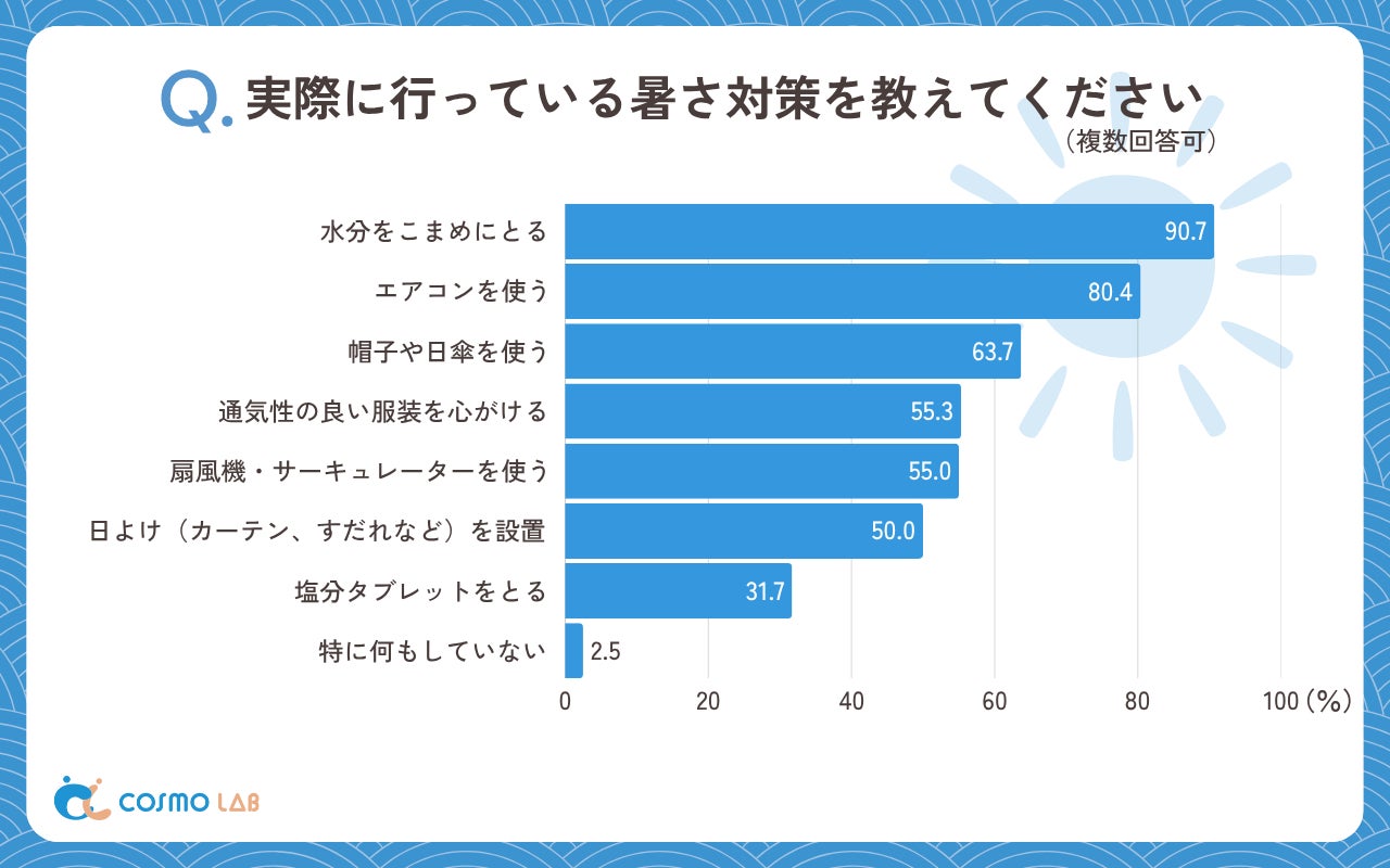 「水分をこまめにとる」(90.7%)が最多で、次いで「エアコンを使う」(80.4%)、「帽子や日傘を使う」(63.7%)と続きました。「通気性の良い服装を心がける」(55.3%)や「扇風機・サーキュレーターを使う」(55.0%)なども半数を超え、複数の対策を組み合わせて実施する傾向が見られます。
