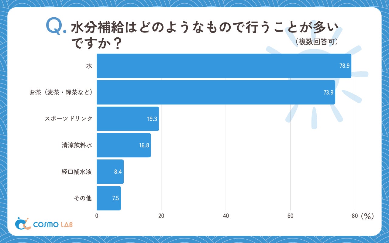 「水」(78.9%)と「お茶(麦茶・緑茶など)」(73.9%)が上位を占めました。「スポーツドリンク」(19.3%)や「清涼飲料水」(16.8%)など糖分を含む飲料は抑えられていました。