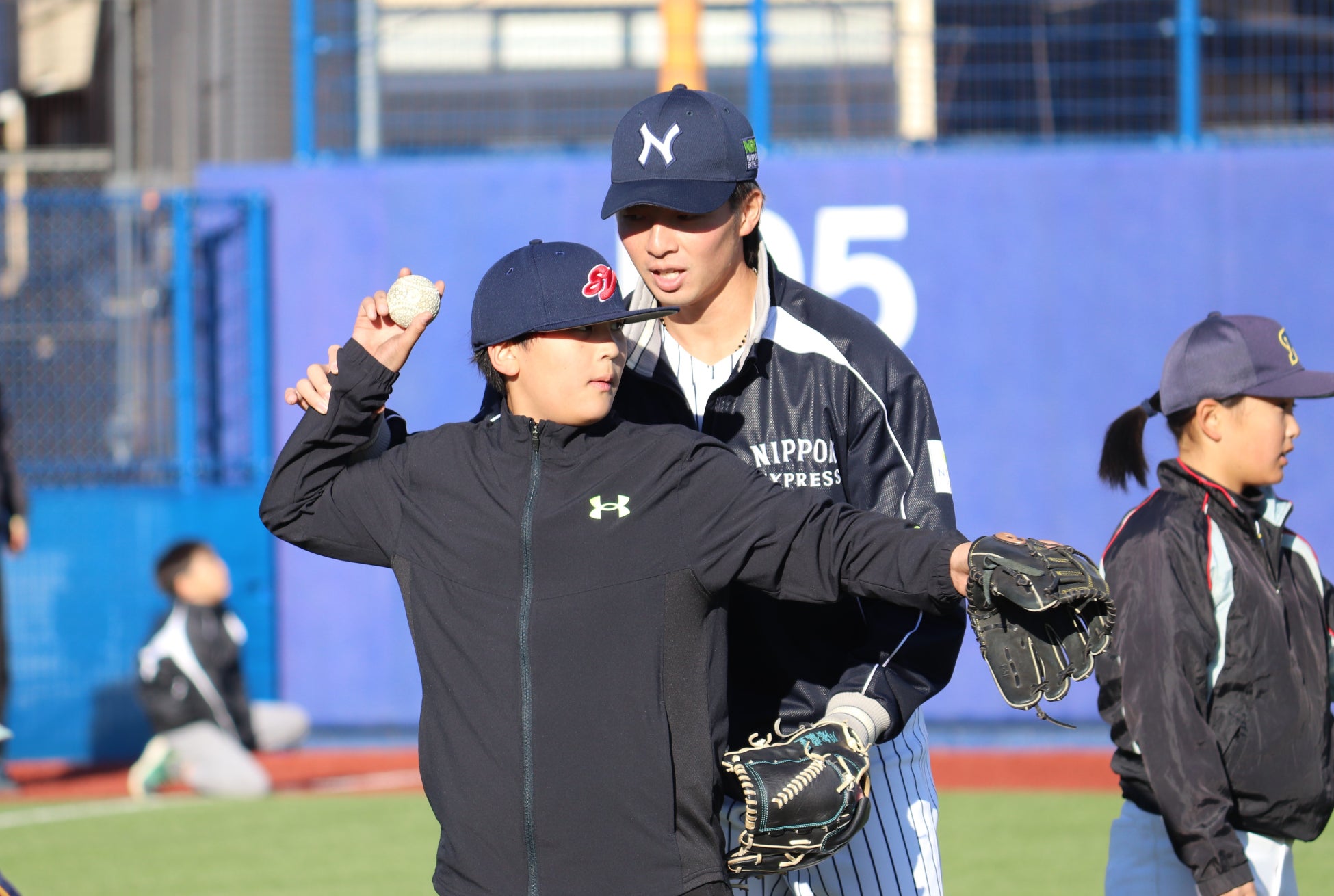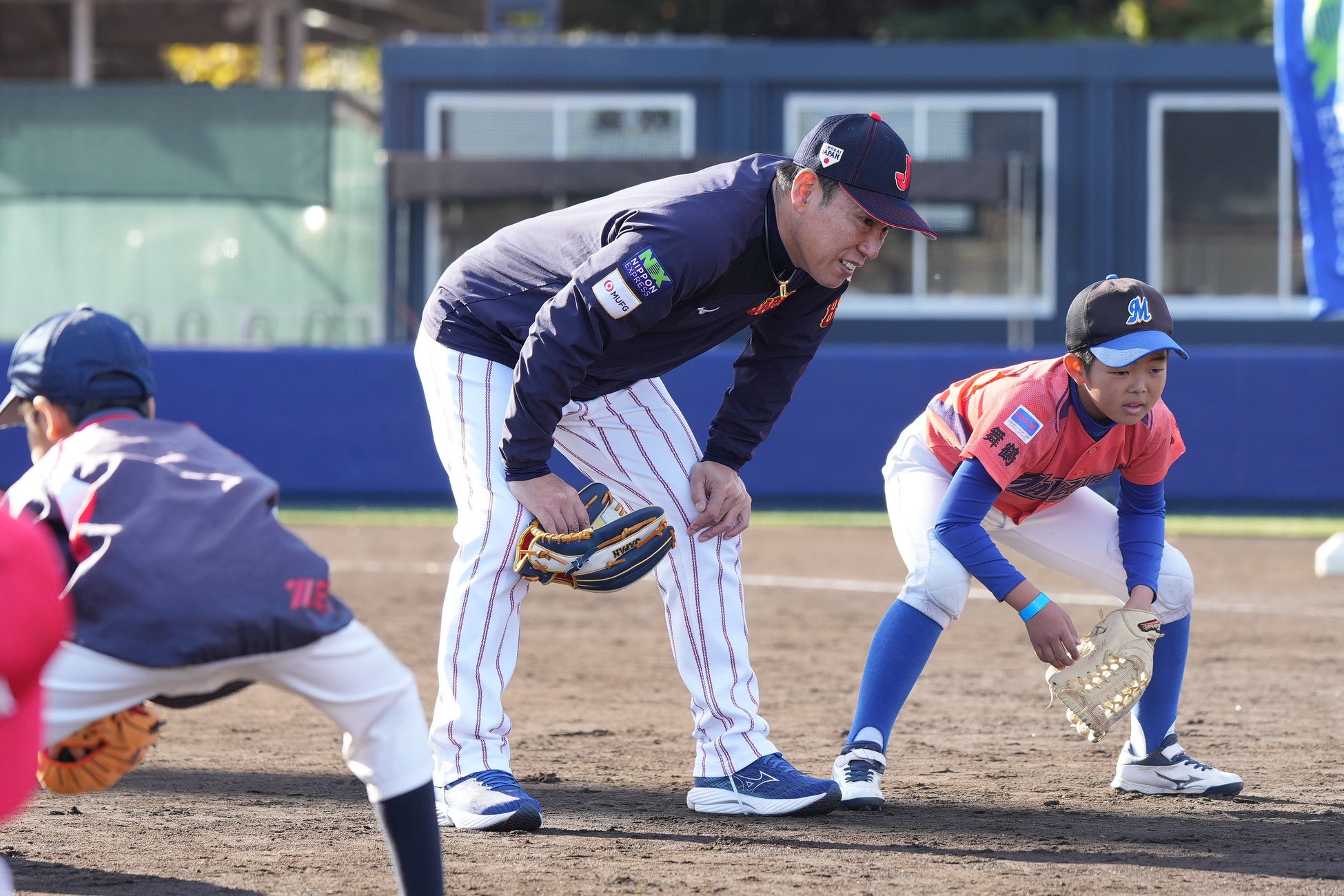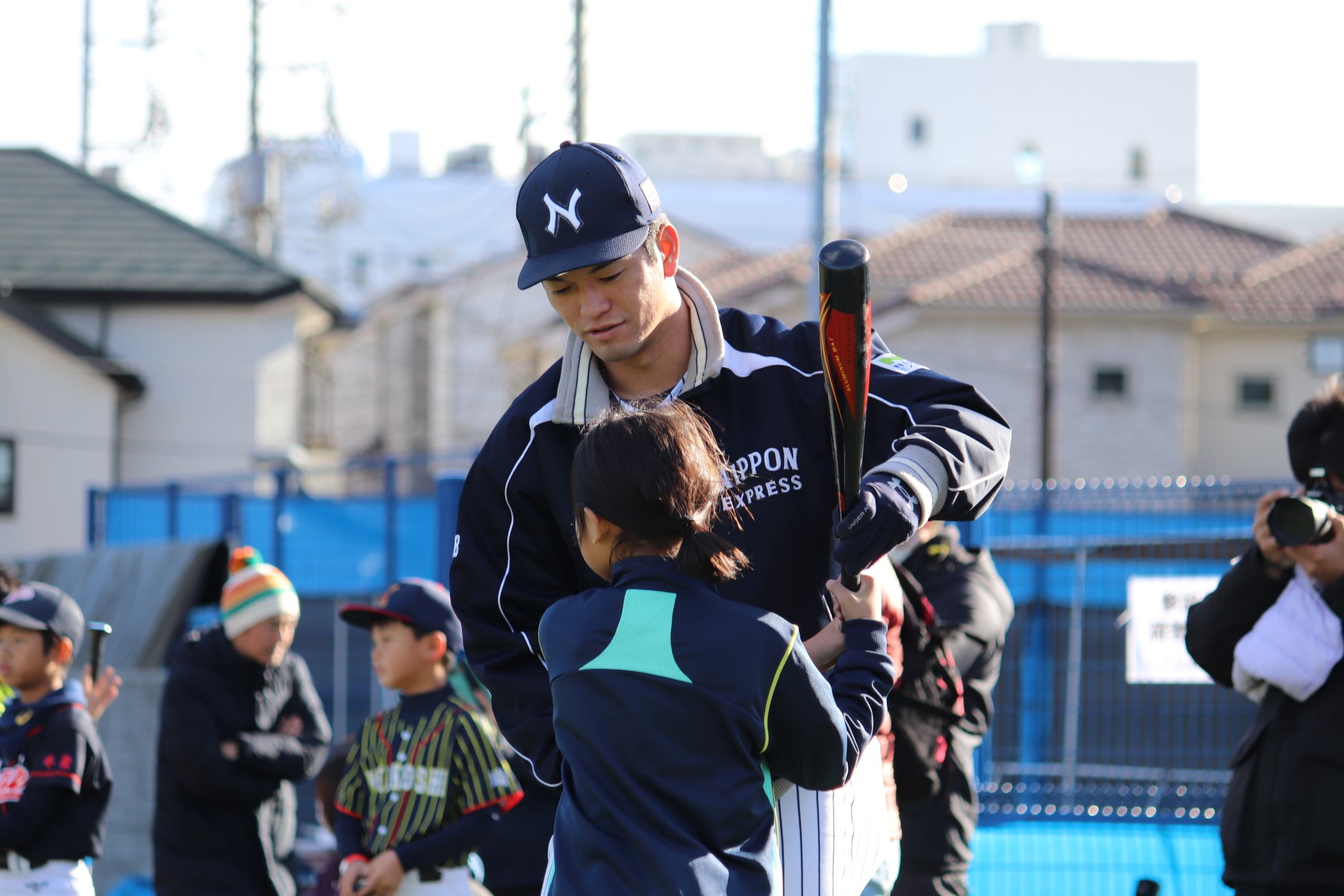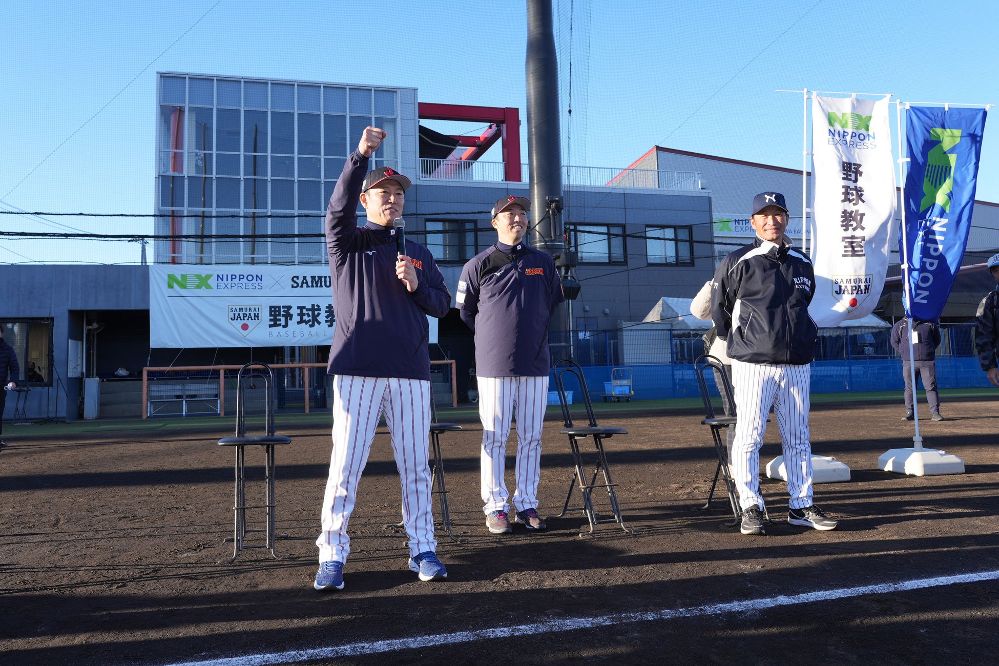 NIPPON EXPRESSホールディングス株式会社(社長:堀切智)は、12月8日(日)、さいたま市浦和区の「NIPPON EXPRESS浦和ボールパーク」において、「NXグループ×侍ジャパン 野球教室」を開催しました。特別講師に侍ジャパンの井端弘和監督と吉見一起投手コーチを迎え、日本通運野球部メンバーと共に、埼玉県内等の少年野球チームとNXグループ従業員の家族、99名の子どもたちに技術指導を行いました。