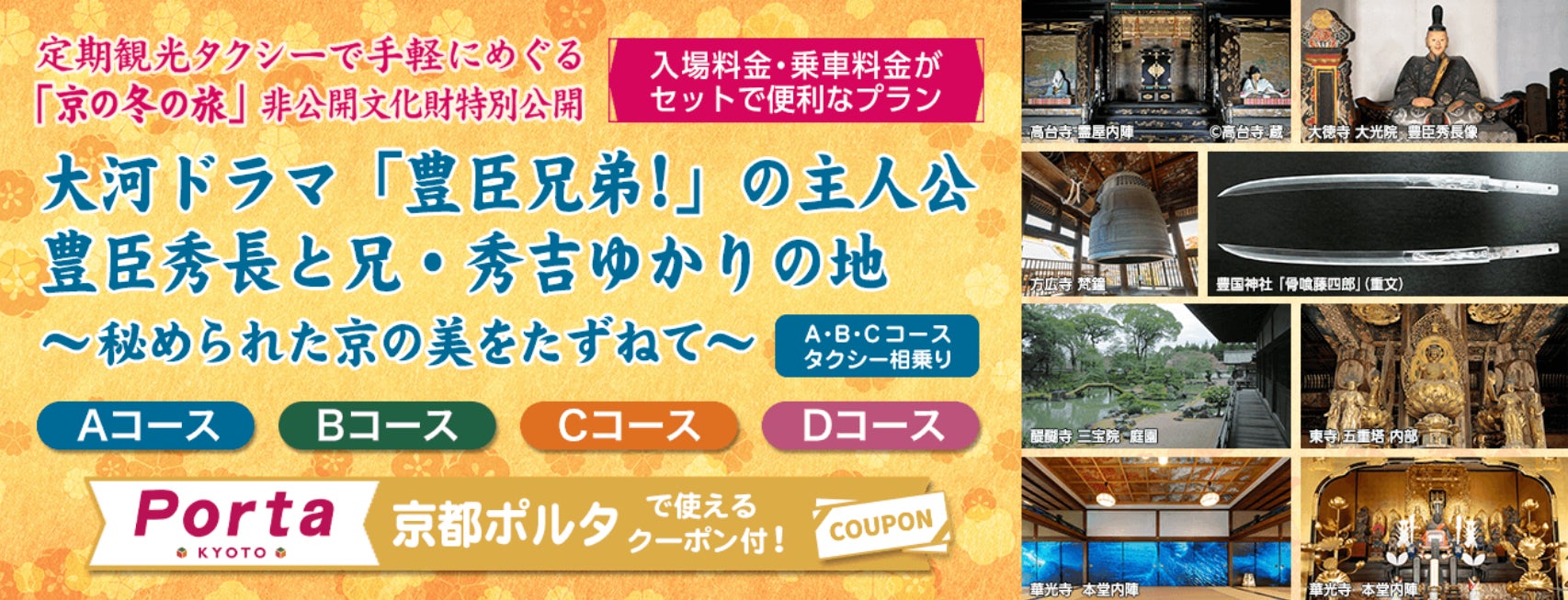 行程:京都駅(9時30分出発~14時出発までの間、出発時間調整可能)=希望の観光地(京の冬の旅非公開文化財特別公開のうち数か所)=京都市内(お客様と相談のうえ調整可能)