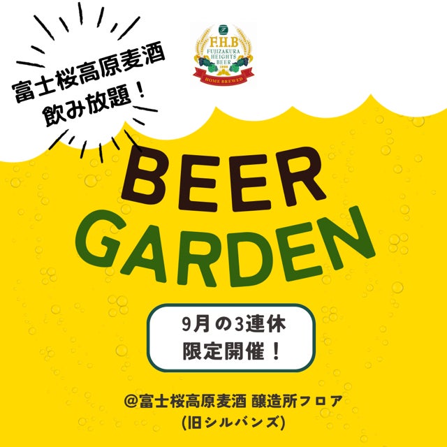富士観光開発株式会社(山梨県南都留郡富士河口湖町 代表取締役社長 志村和也)が醸造・販売する「富士桜高原麦酒」では、9月14日(土)~16日(祝・月)、9月21日(土)~23日(祝・月)の6日間限定で、富士すばるランド隣接の富士桜高原麦酒・醸造所(旧シルバンズ)にて、富士桜高原麦酒飲み放題イベントBEER GARDEN「ビアガーデン」を開催いたします。