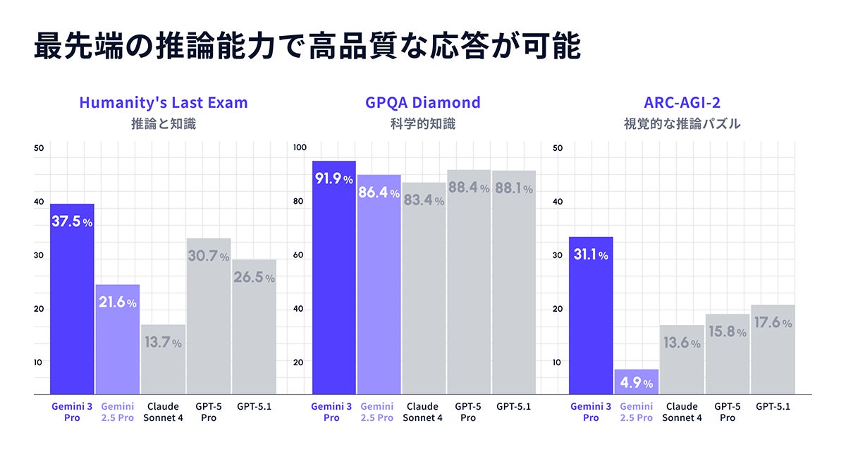「Gemini 3 Pro」は、Google社が開発した最も知的なAIモデルで、最先端の推論能力を備え、あらゆるアイデアを実現できる革新的なモデルです。Humanity’s Last Examおよび GPQA Diamondでトップスコアを記録し、博士号レベルの推論能力を示しています。※